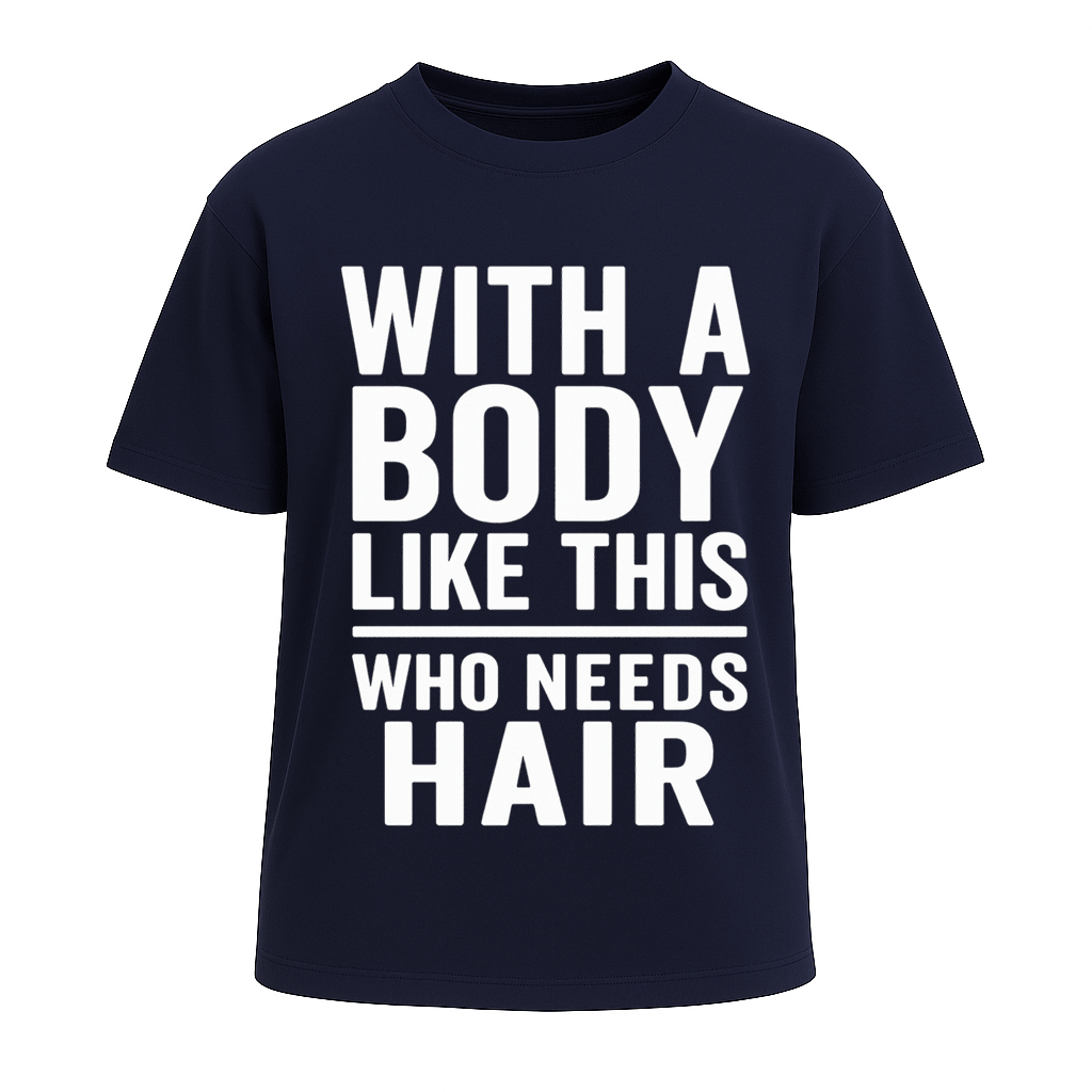 Motivo: testo bianco in grassetto con la scritta "Con un corpo così, chi ha bisogno dei capelli?"