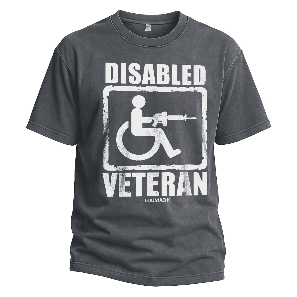 Caratterizzata da una coraggiosa reinterpretazione dell'icona della sedia a rotelle che impugna un fucile, abbinata alla scritta Disabled Veteran , questa maglietta rende omaggio a coloro che si sono sacrificati, sono sopravvissuti e continuano a stare in piedi (anche da seduti).