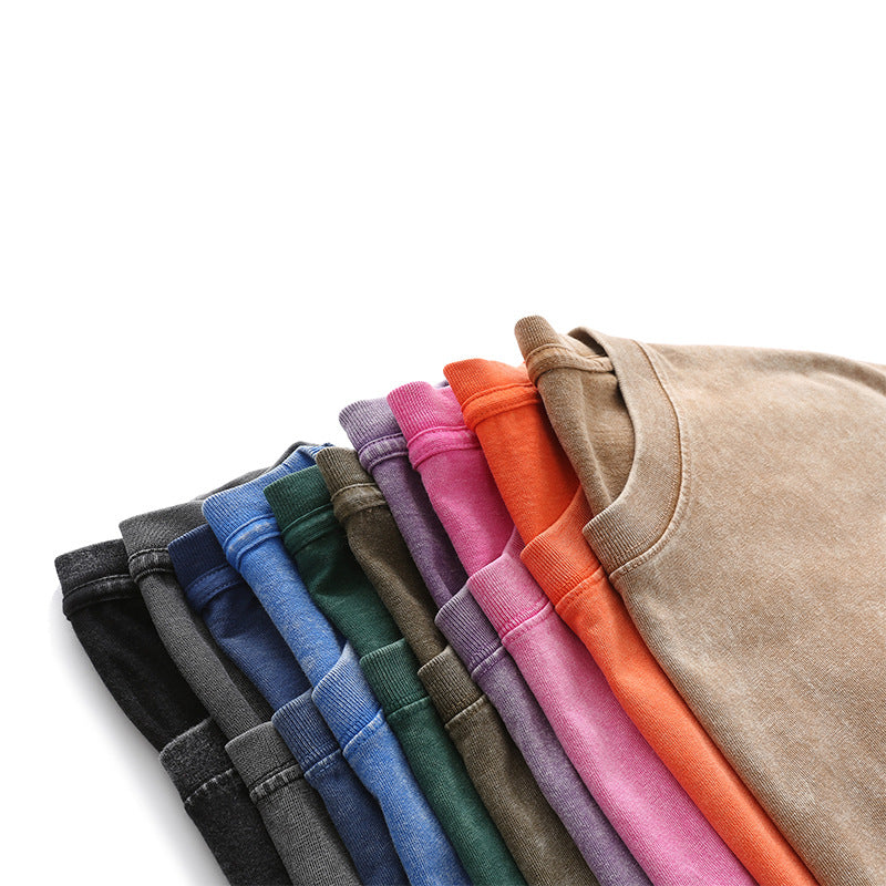 Dettaglio: finitura lavata, spalle scese, molteplici opzioni di colore tinto a pigmento