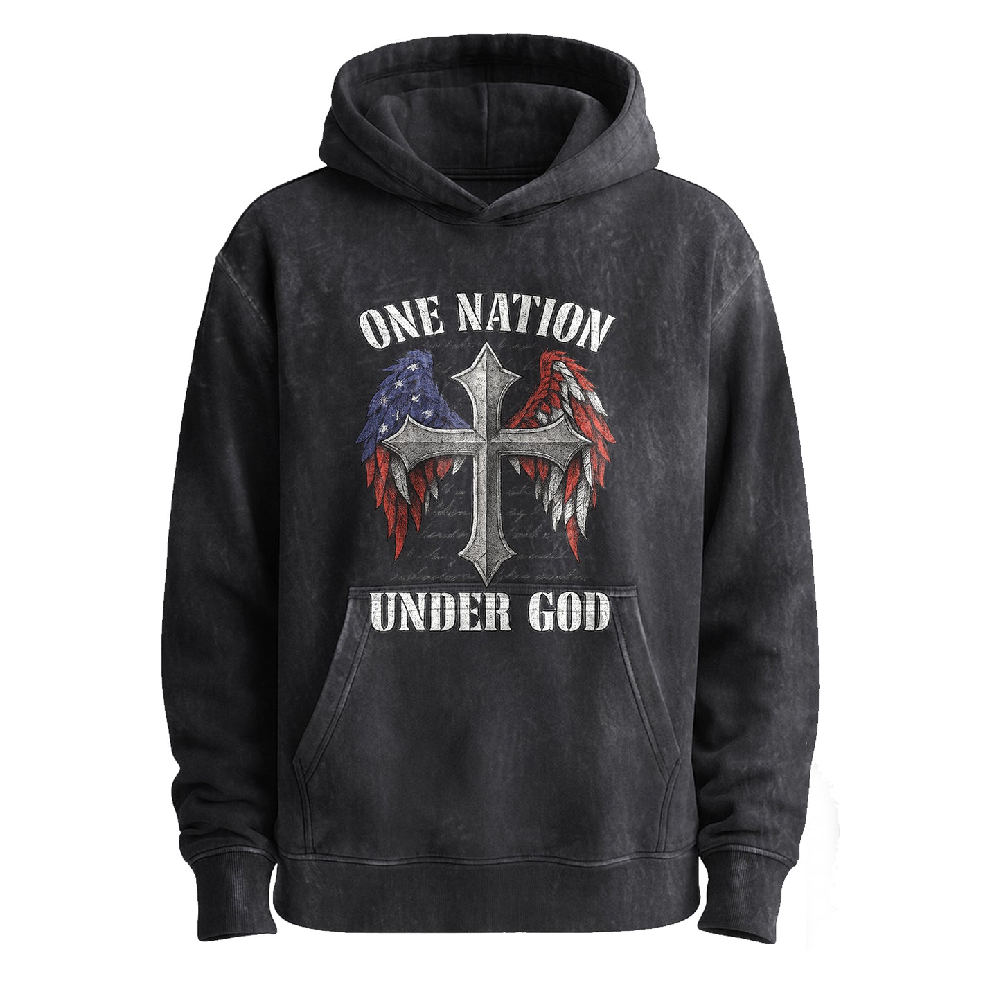 Fede, grinta e tradizione in un unico capo. Questa felpa con cappuccio verde militare, con effetto vintage, presenta una vistosa croce in metallo affiancata da ali rosse, bianche e blu, con la scritta "ONE NATION UNDER GOD". Realizzata in robusto cotone 80% da 350 g, offre una sensazione di morbidezza e comfort fin dal primo utilizzo.