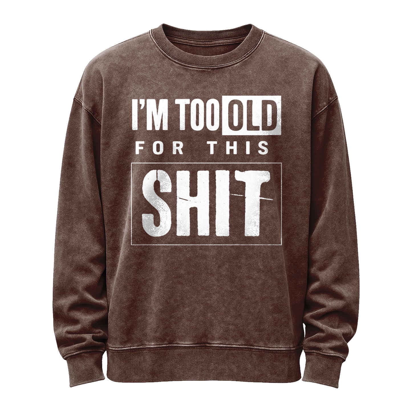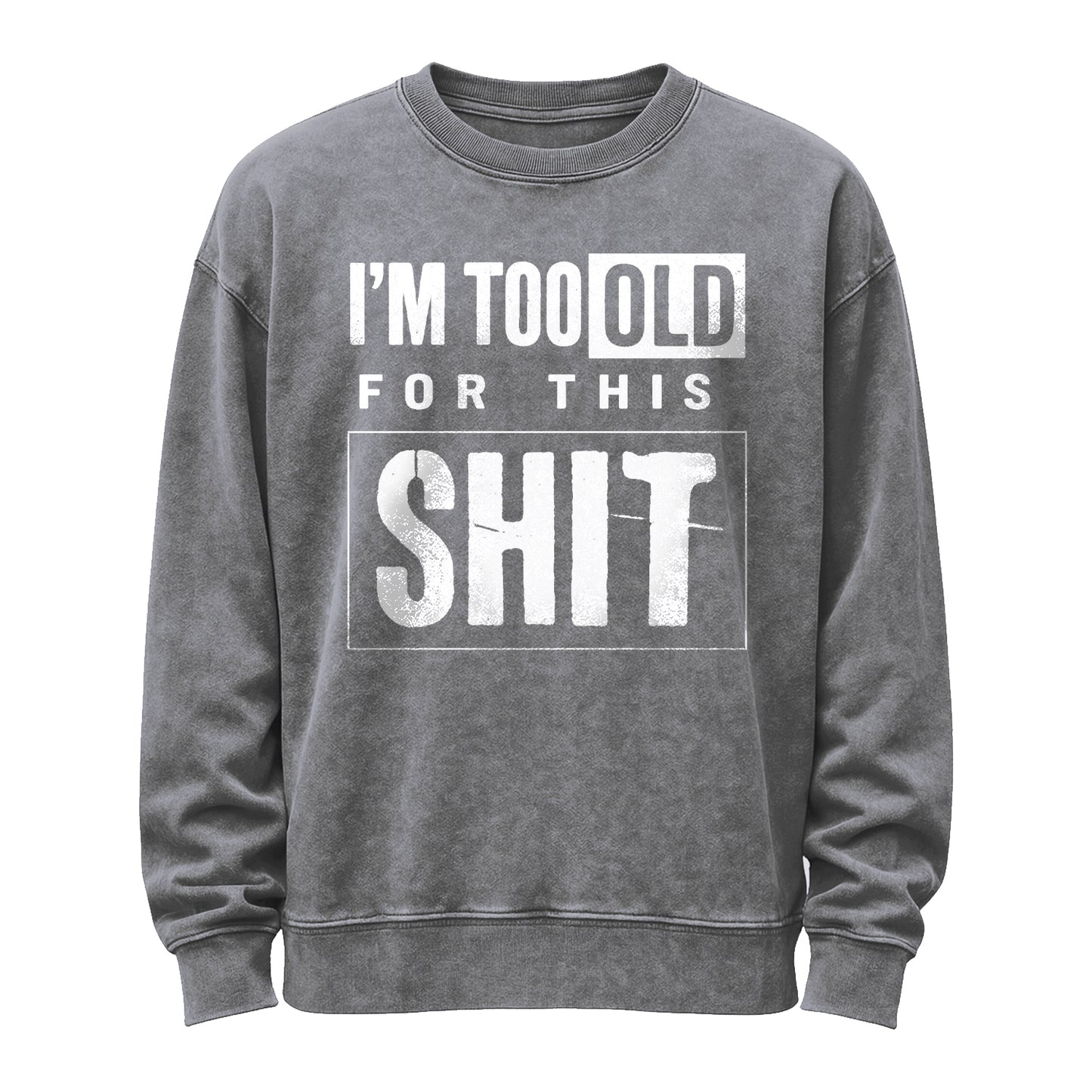 Questa maglia girocollo vintage in nero lavato presenta una scritta bianca audace e consumata, "I'M TOO OLD FOR THIS", sovrapposta a un riquadro oversize con la scritta "SH*T", per un'atmosfera sfacciata e senza fronzoli.