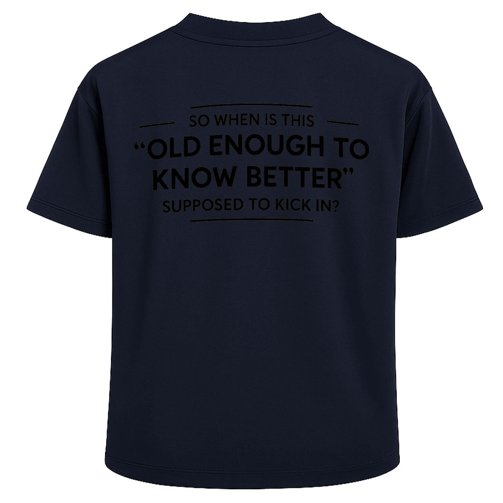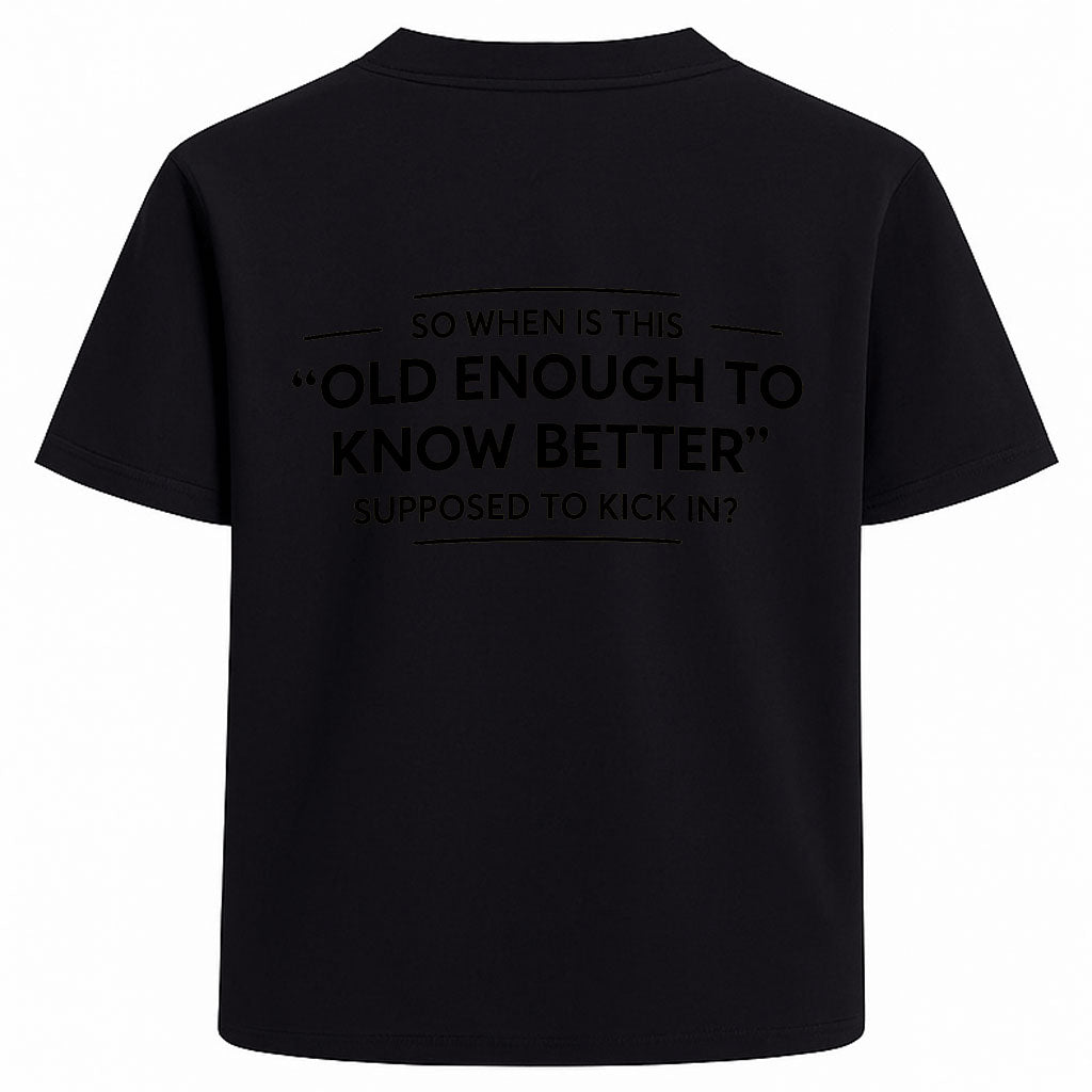Hai mai avuto la sensazione che l'età adulta si sia dimenticata di consegnare il manuale? Questa maglietta cattura perfettamente questa sensazione con il suo messaggio spiritoso: "Allora, quando dovrebbe entrare in gioco questo 'vecchio per sapere di più'?". È la scelta perfetta per chi affronta la vita con umorismo e la giusta dose di ribellione.