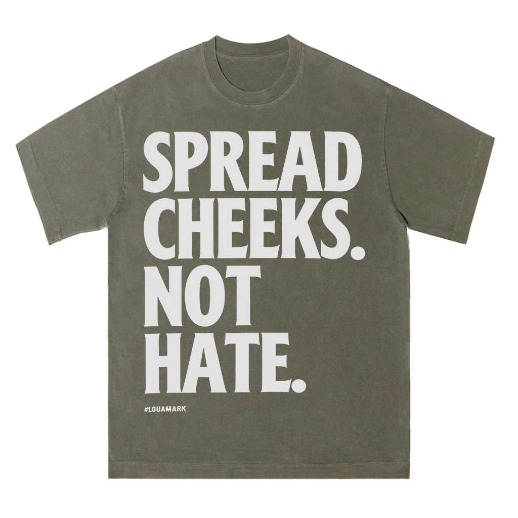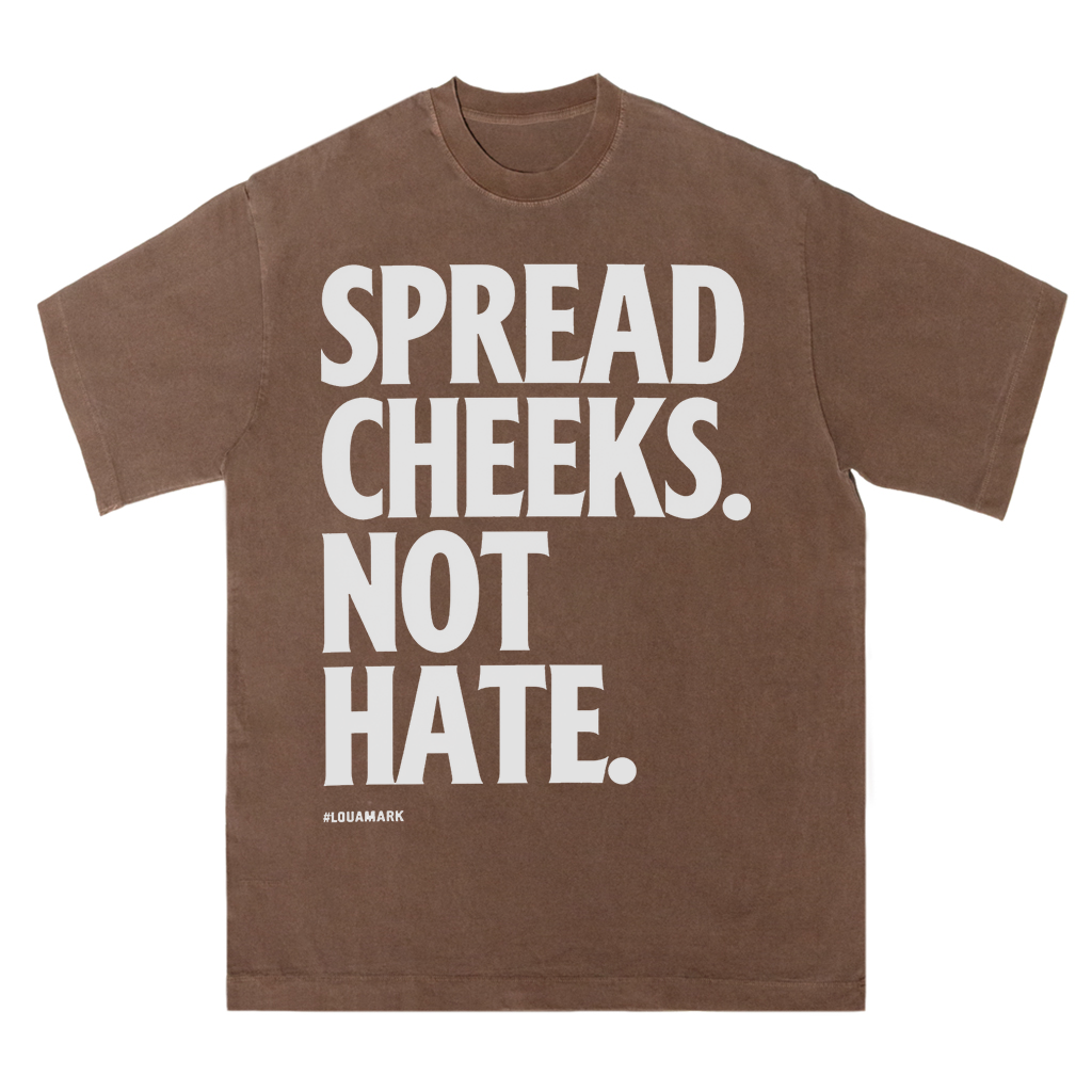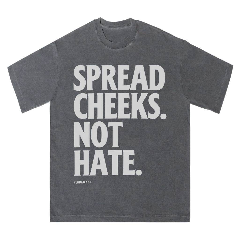 Questa maglietta non si tira indietro, ma li trasmette con un sorriso. Con la scritta in maiuscolo "Spread Cheeks. Not Hate" (Apri le guance. Non odio) in un grande carattere stencil bianco, questa maglietta è un microfono a caduta ambulante.