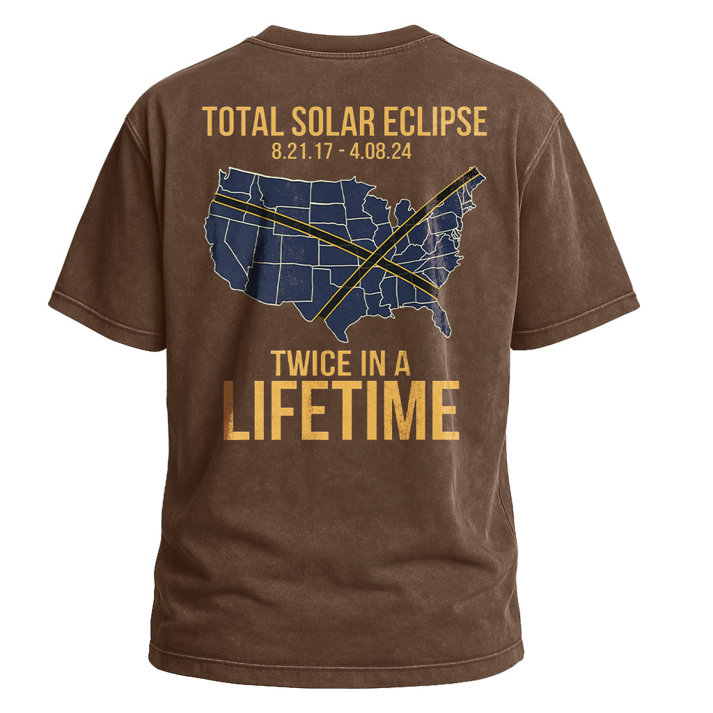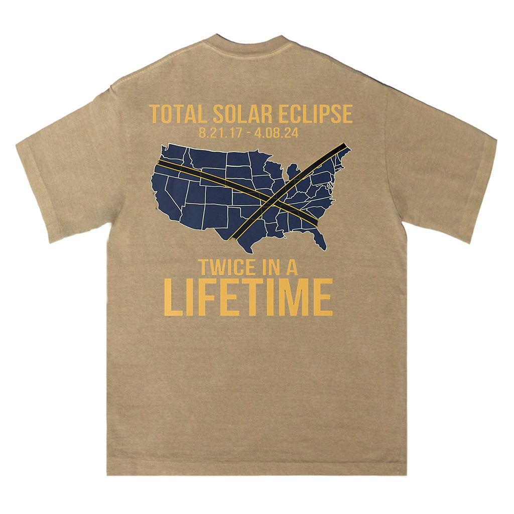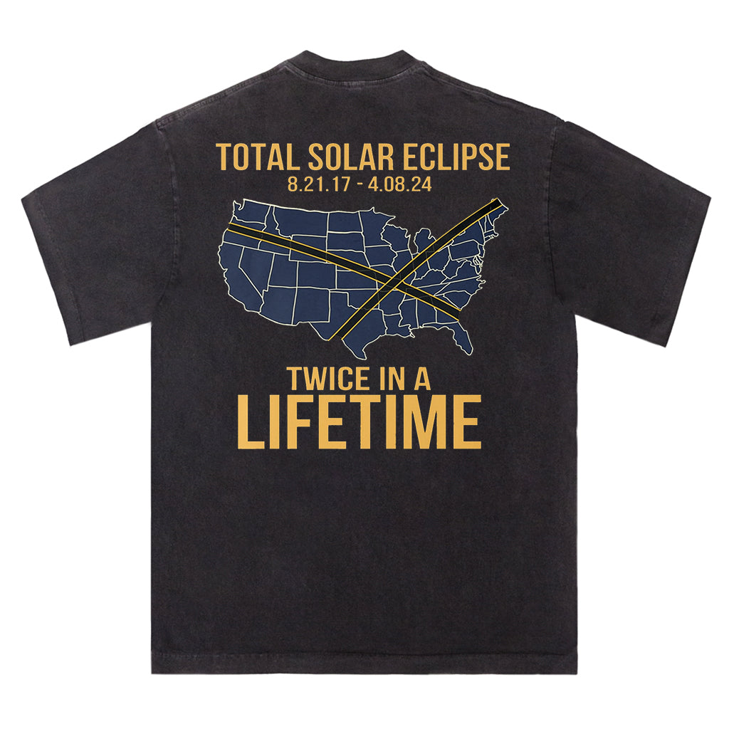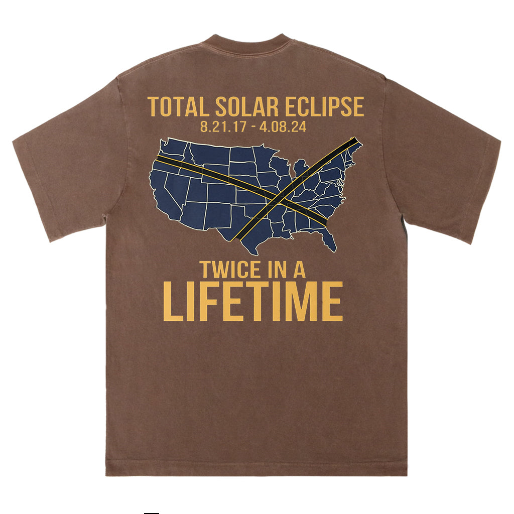 Celebra un raro evento celeste con la maglietta "Total Solar Eclipse Lifetime" di LouMark. Questa maglietta marrone slavato presenta una grafica in stile vintage sul retro della mappa degli Stati Uniti che evidenzia i percorsi di due eclissi solari con le date "8.21.17 - 4.08.24", accompagnata dal testo in grassetto "TOTAL SOLAR ECLIPSE TWICE IN A LIFETIME". Realizzata in 100% cotone per un comodo utilizzo quotidiano.