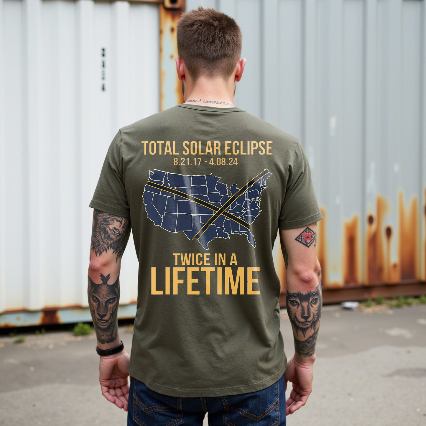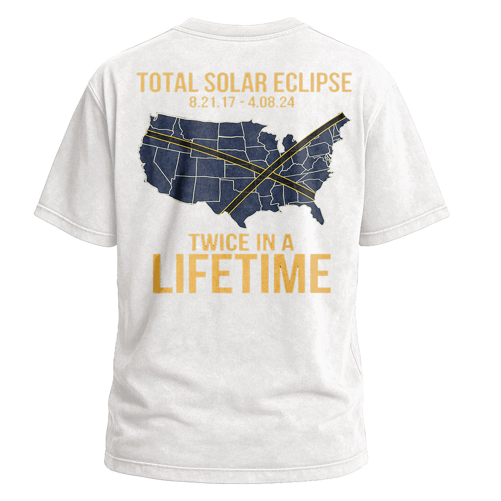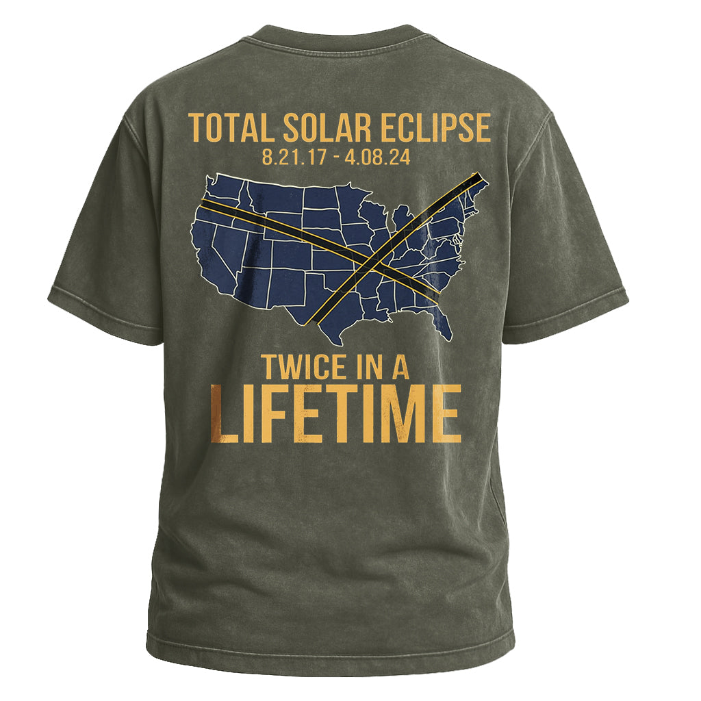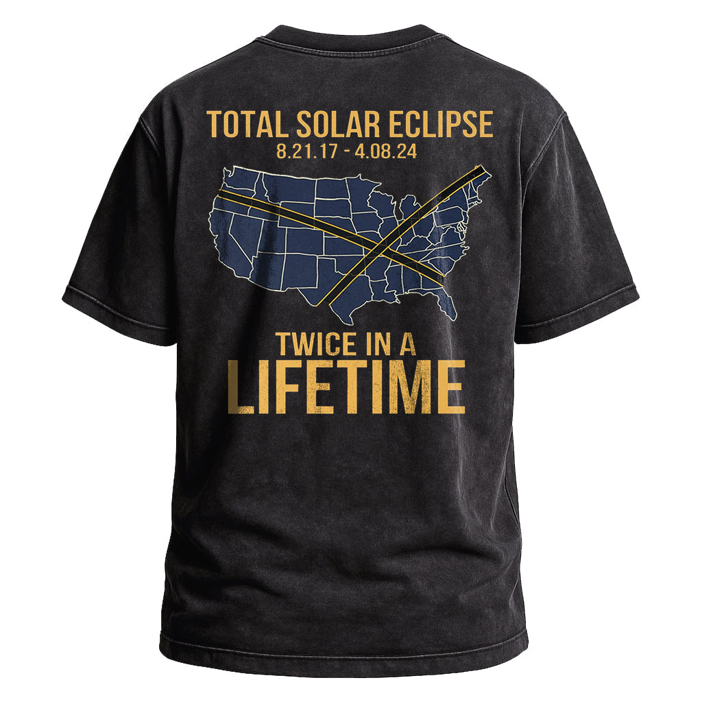 Celebra un raro evento celeste con la maglietta "Total Solar Eclipse Lifetime" di LouMark. Questa maglietta marrone slavato presenta una grafica in stile vintage sul retro della mappa degli Stati Uniti che evidenzia i percorsi di due eclissi solari con le date "8.21.17 - 4.08.24", accompagnata dal testo in grassetto "TOTAL SOLAR ECLIPSE TWICE IN A LIFETIME". Realizzata in 100% cotone per un comodo utilizzo quotidiano.
