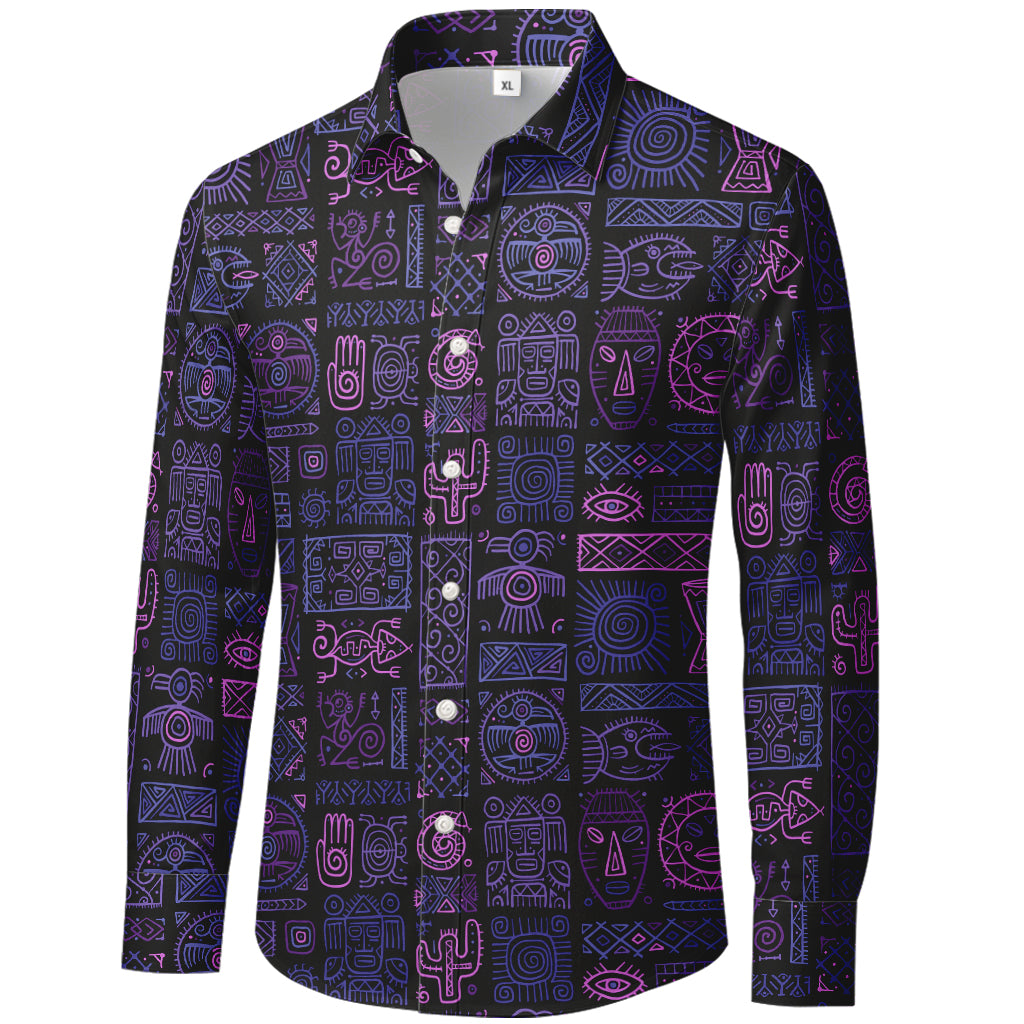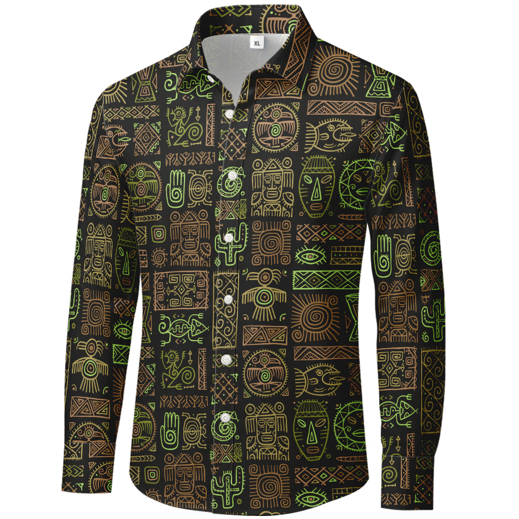 L'antico incontra il moderno. Questa camicia a maniche lunghe con bottoni presenta una griglia di glifi in stile tribale – maschere, soli, spirali, mani, cactus e segni geometrici – delineati in verde acqua, arancione bruciato e sabbia su fondo nero intenso. Il tessuto liscio in 100% poliestere è leggero, antipiega e ad asciugatura rapida, ideale per look streetwear, uffici creativi, festival e viaggi.