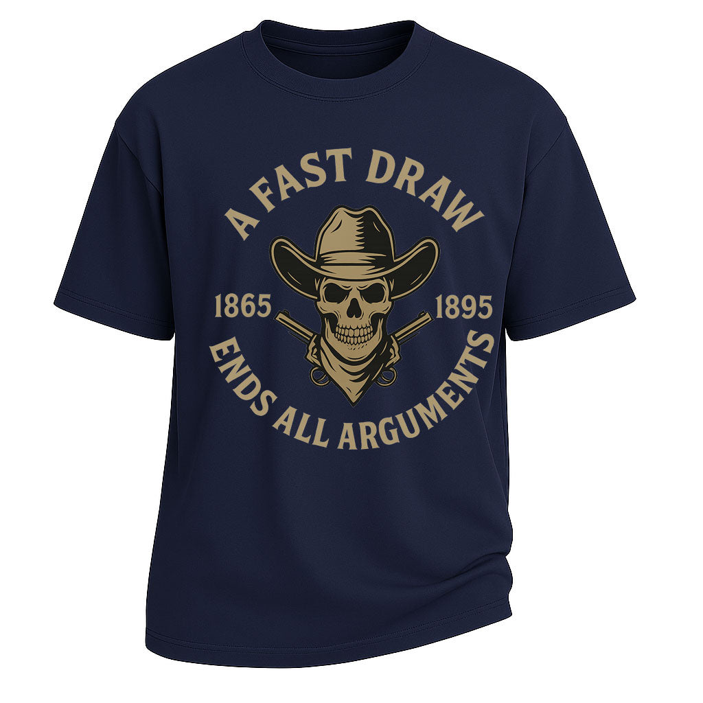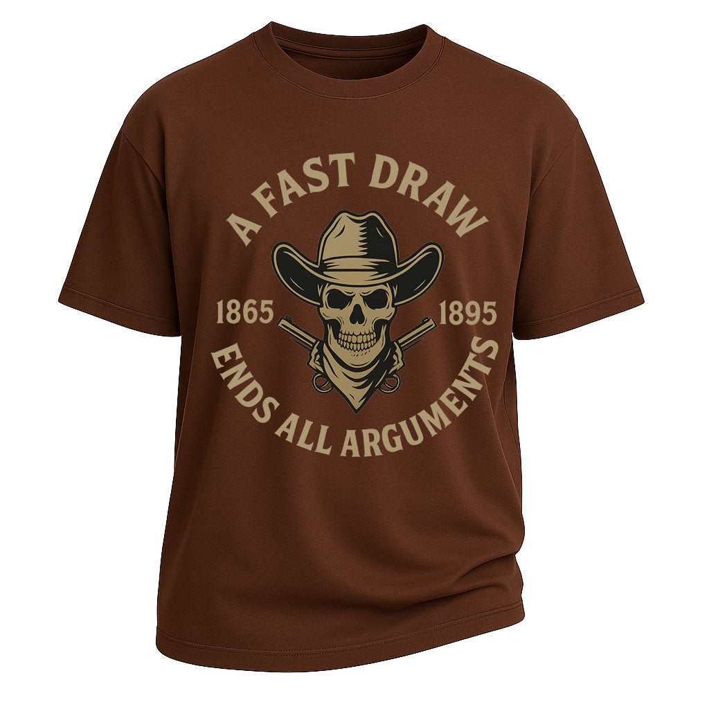Trasmetti il coraggio e il pericolo del selvaggio West con la t-shirt LouMark "A Fast Draw Ends All Arguments". Caratterizzata da una grafica con teschio da cowboy, revolver incrociati e scritte vintage, questa audace grafica rende omaggio all'epoca dei pistoleri. Realizzata in 100% cotone pesante da 260 g, unisce comfort oversize, resistenza e un robusto stile western, perfetta per l'uso quotidiano.