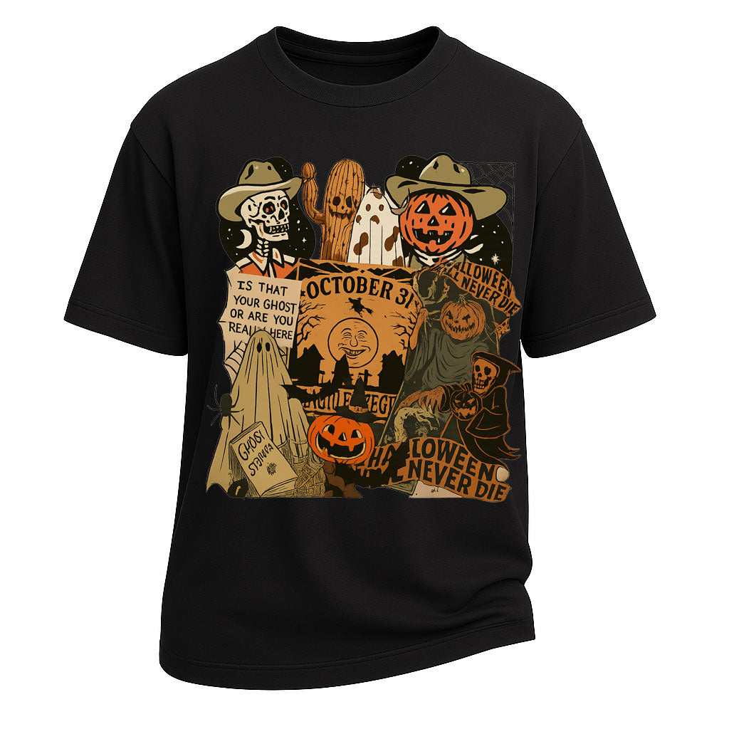 Maglietta grafica con scheletro di zucca di Halloween da cowboy