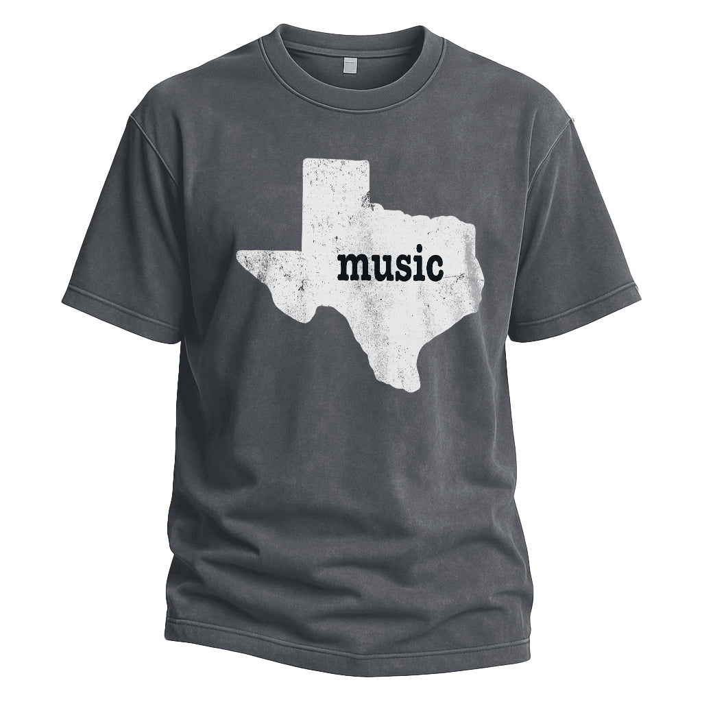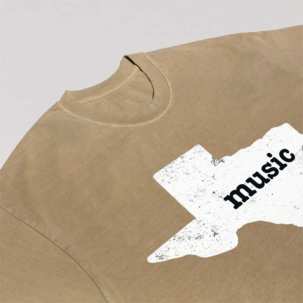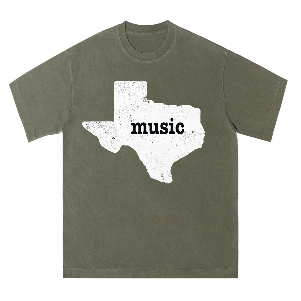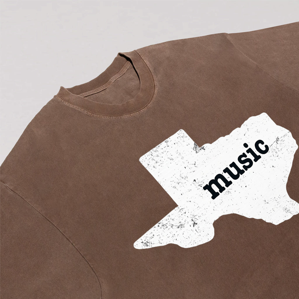 Celebra il cuore della cultura musicale texana con la t-shirt Texas Music di LouMark. Questa maglietta marrone slavato presenta un'audace silhouette bianca dello stato del Texas con la parola "music" stampata in nero effetto consumato. Realizzata in 100% cotone, offre un comfort classico e un design semplice ma iconico.