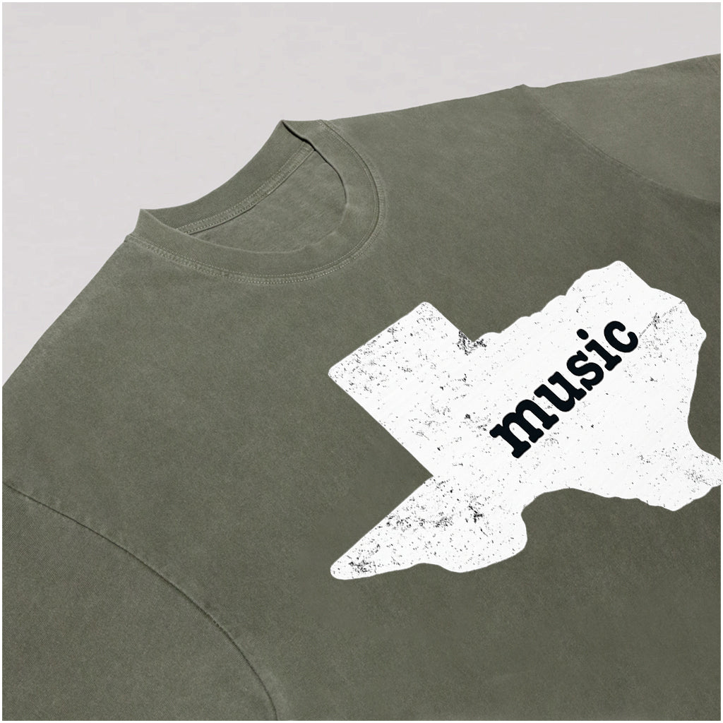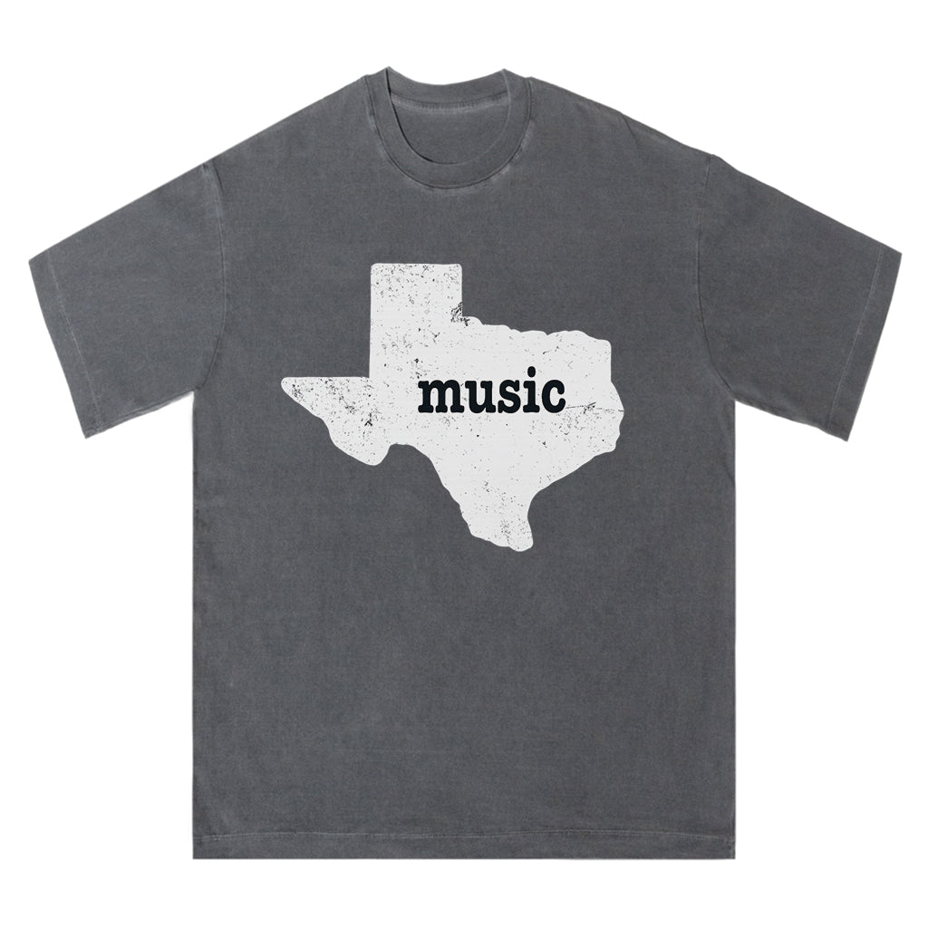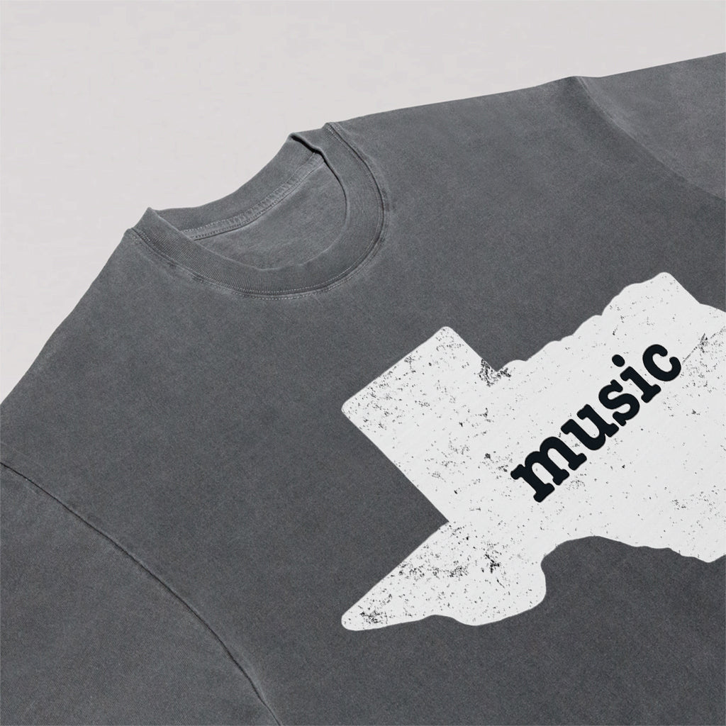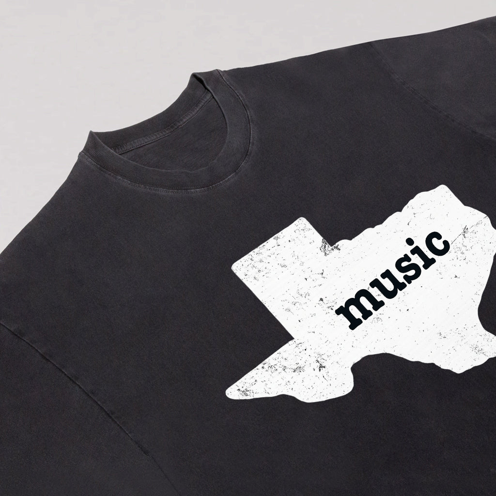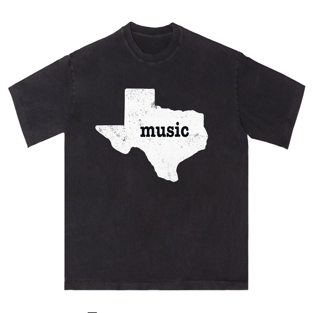 Celebra il cuore della cultura musicale texana con la t-shirt Texas Music di LouMark. Questa maglietta marrone slavato presenta un'audace silhouette bianca dello stato del Texas con la parola "music" stampata in nero effetto consumato. Realizzata in 100% cotone, offre un comfort classico e un design semplice ma iconico.
