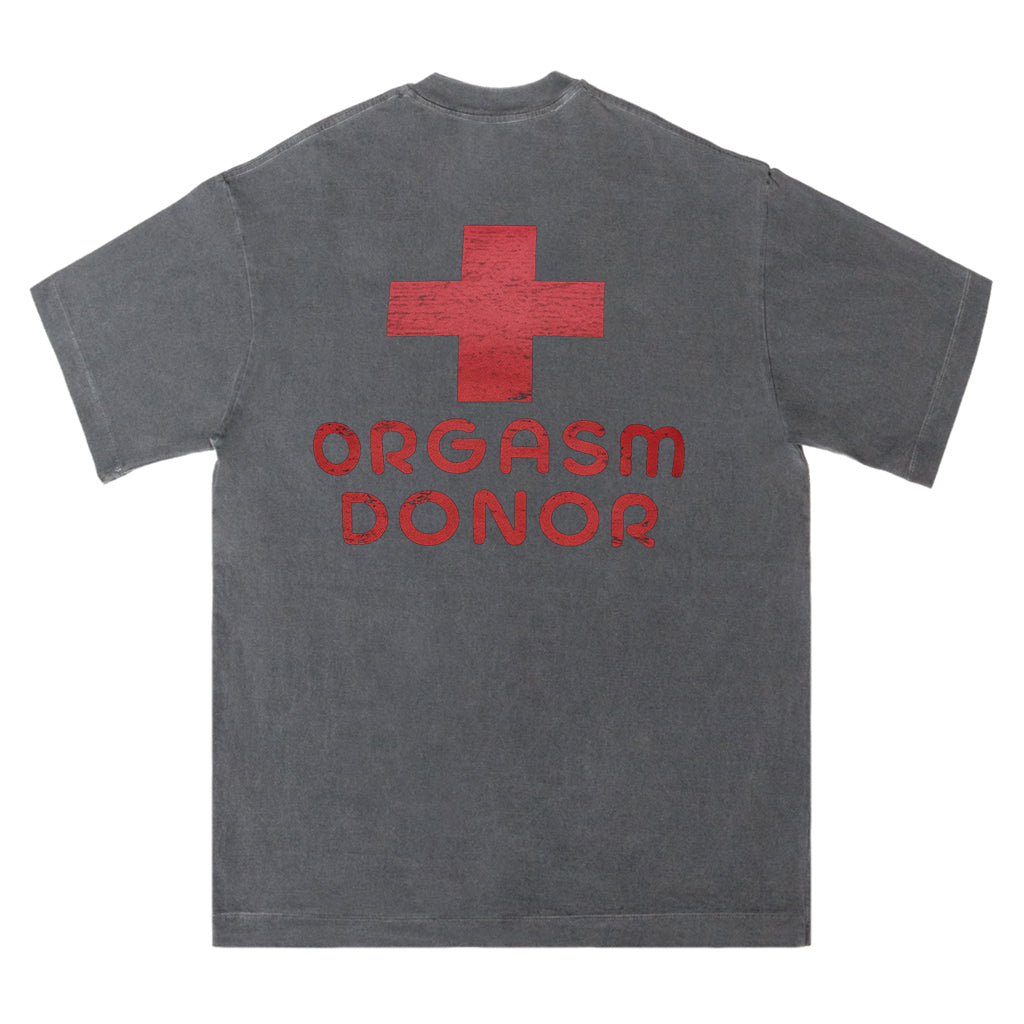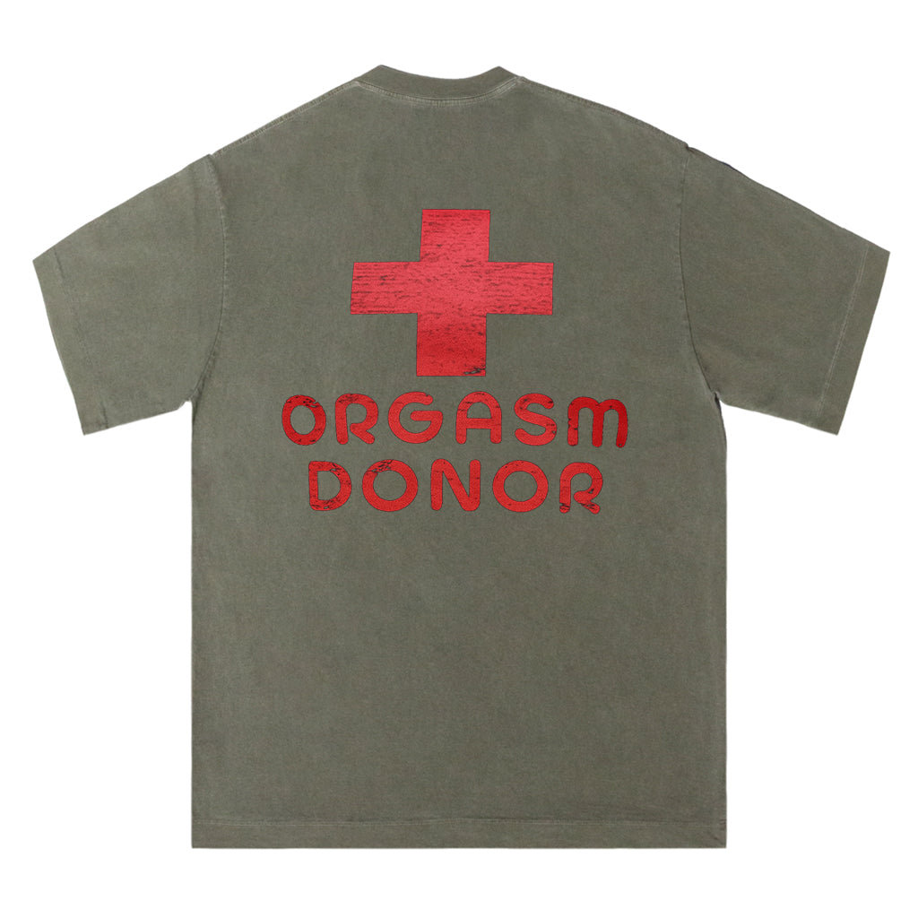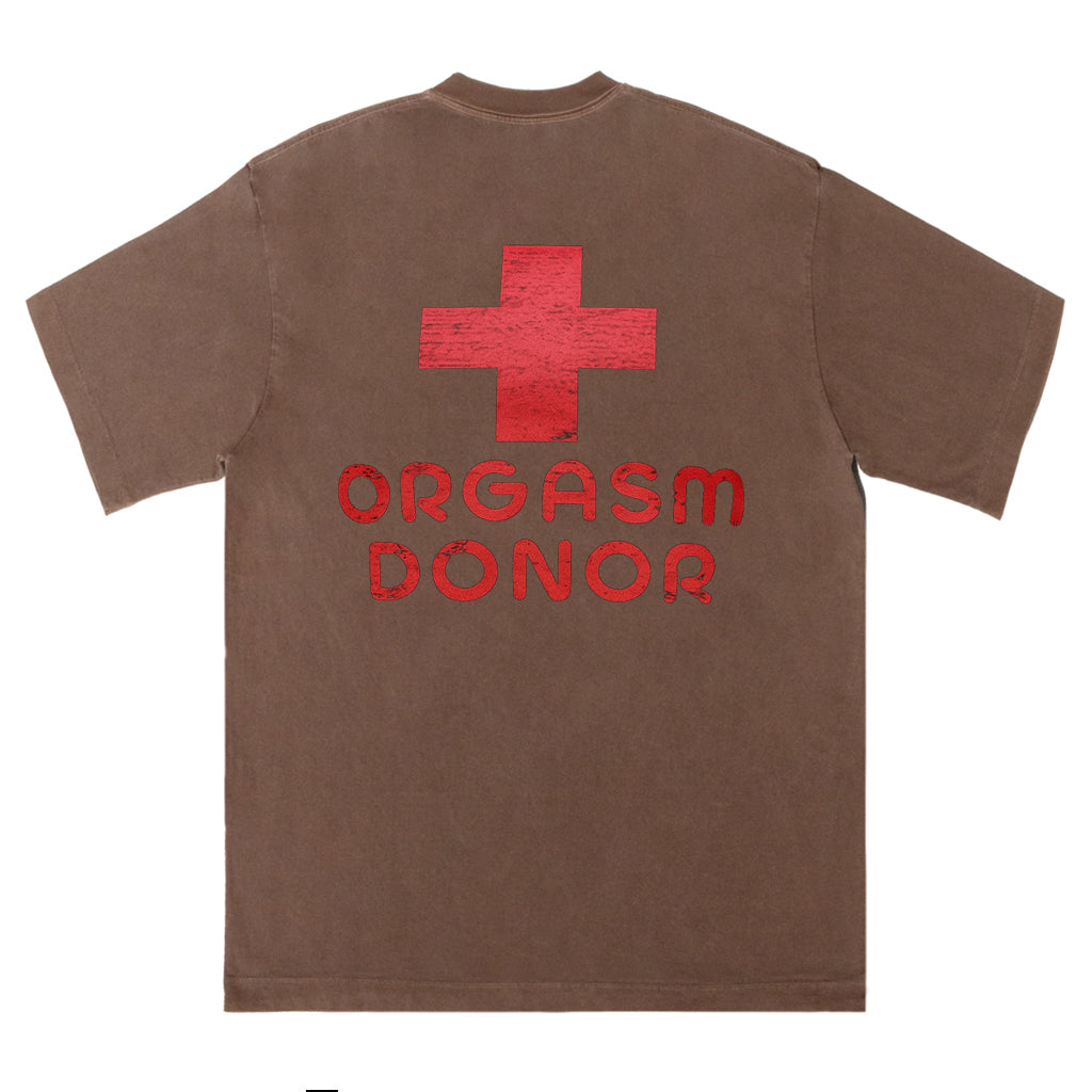 Setzen Sie mit LouMarks Orgasm Donor T-Shirt ein mutiges und verspieltes Statement. Dieses verwaschene braune Shirt zeigt ein rotes, abgenutztes medizinisches Kreuz mit dem Text „ORGASM DONOR“. Hergestellt aus 100 % Baumwolle für hohen Tragekomfort und eine freche Note.