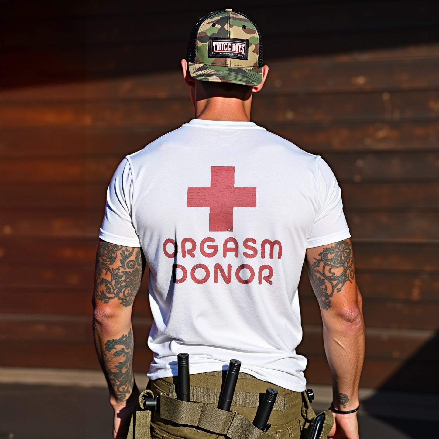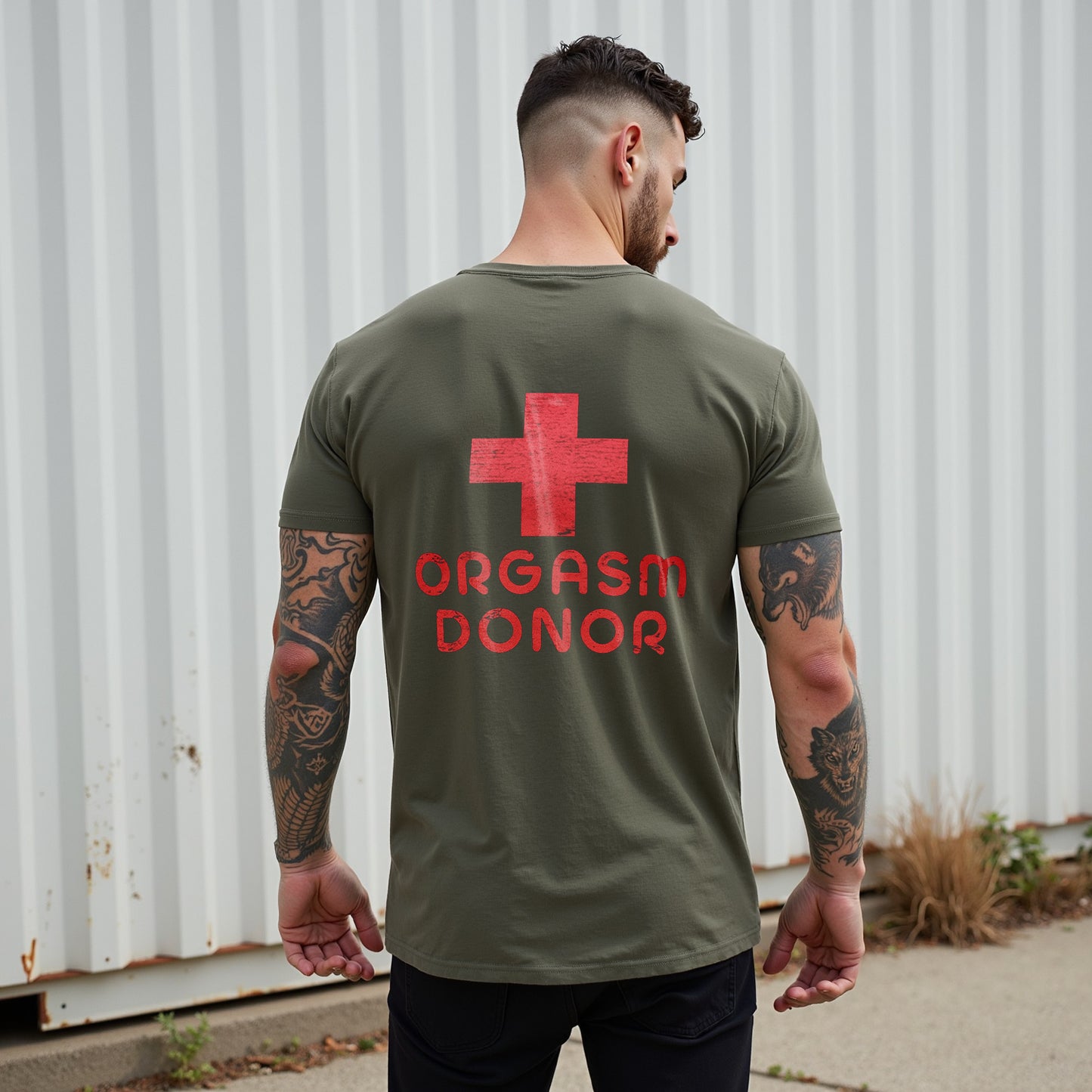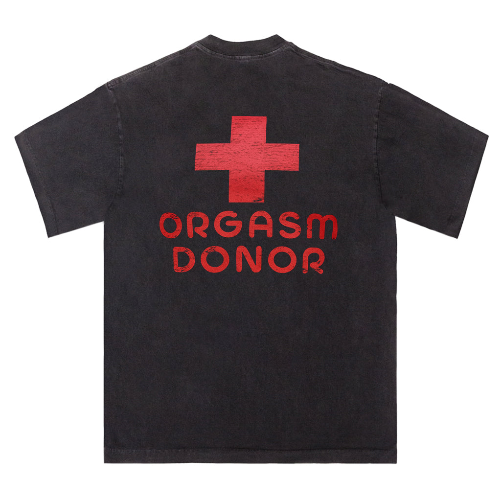 Setzen Sie mit LouMarks Orgasm Donor T-Shirt ein mutiges und verspieltes Statement. Dieses verwaschene braune Shirt zeigt ein rotes, abgenutztes medizinisches Kreuz mit dem Text „ORGASM DONOR“. Hergestellt aus 100 % Baumwolle für hohen Tragekomfort und eine freche Note.