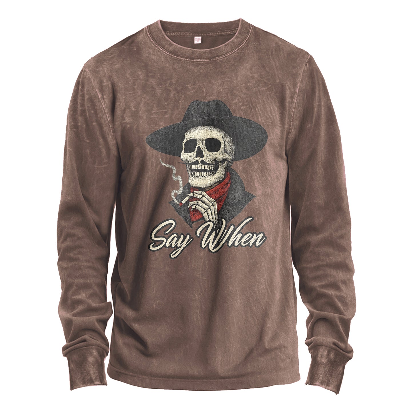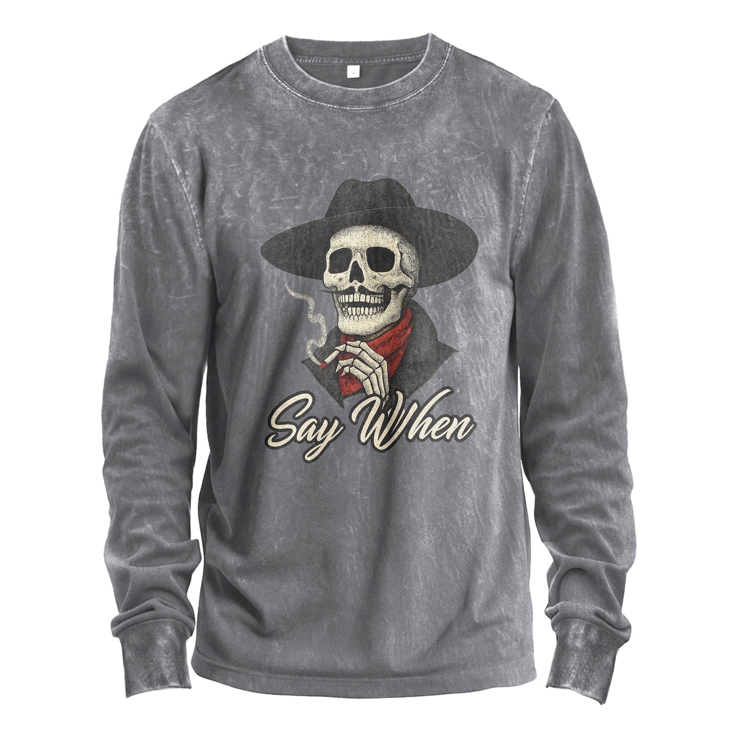 Western-Charme mit einem Augenzwinkern. Dieses olivgrüne Langarmshirt im Vintage-Look zeigt einen rauchenden Skelett-Revolverhelden und den Schriftzug „Sag wann“. Gefertigt aus robustem 230-g-Baumwollstoff (100 %) für ein weiches, angenehm eingetragenes Tragegefühl, das lange anhält.