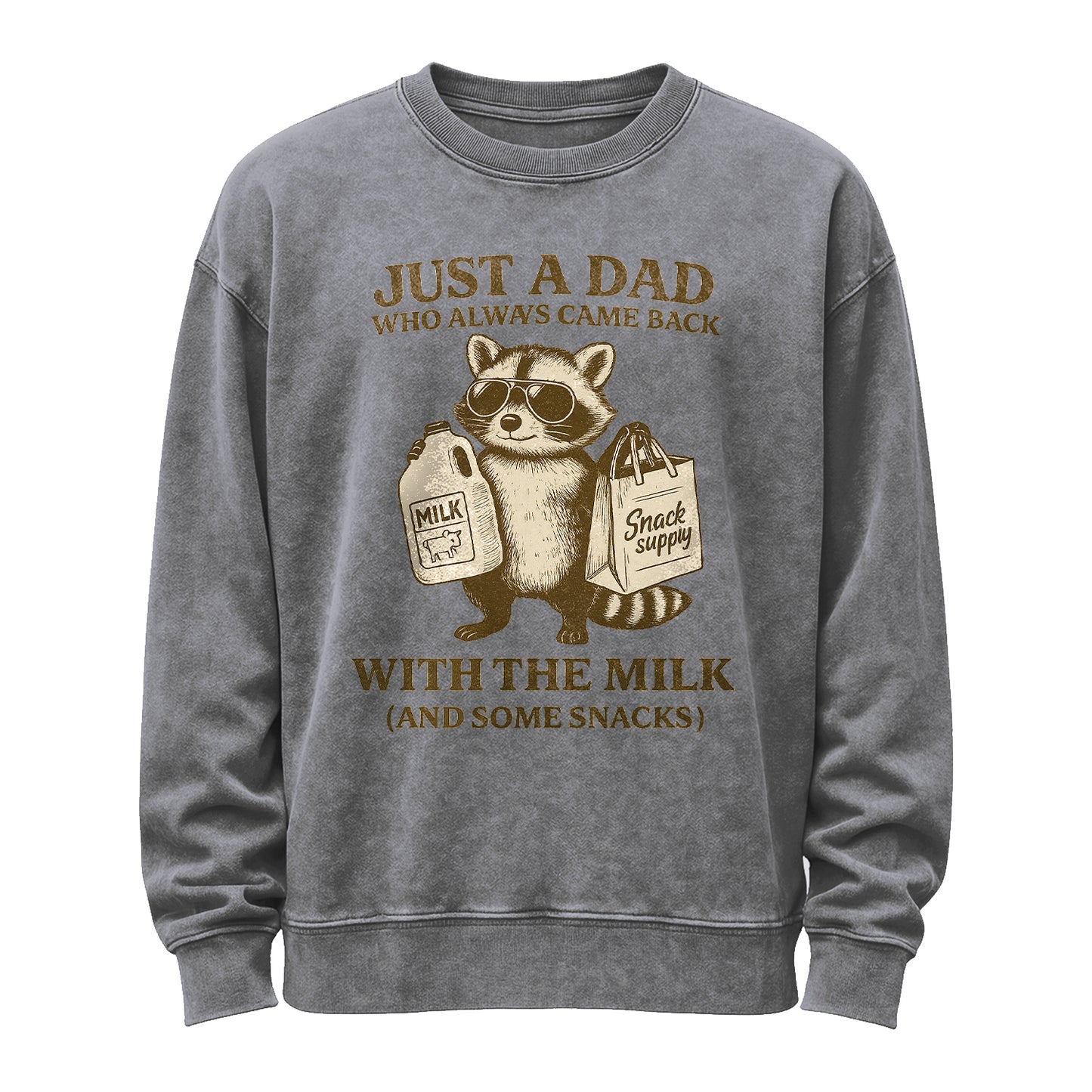 Dad energy, upgraded. This vintage-washed black sweatshirt features a cool raccoon in sunglasses carrying a jug of milk and a paper bag labeled “Snack supply,” with the line “Just a Dad Who Always Came Back With the Milk (And Some Snacks).” Built from substantial 350g fleece (80% cotton / 20% polyester) for a soft, broken-in feel right out of the bag.
