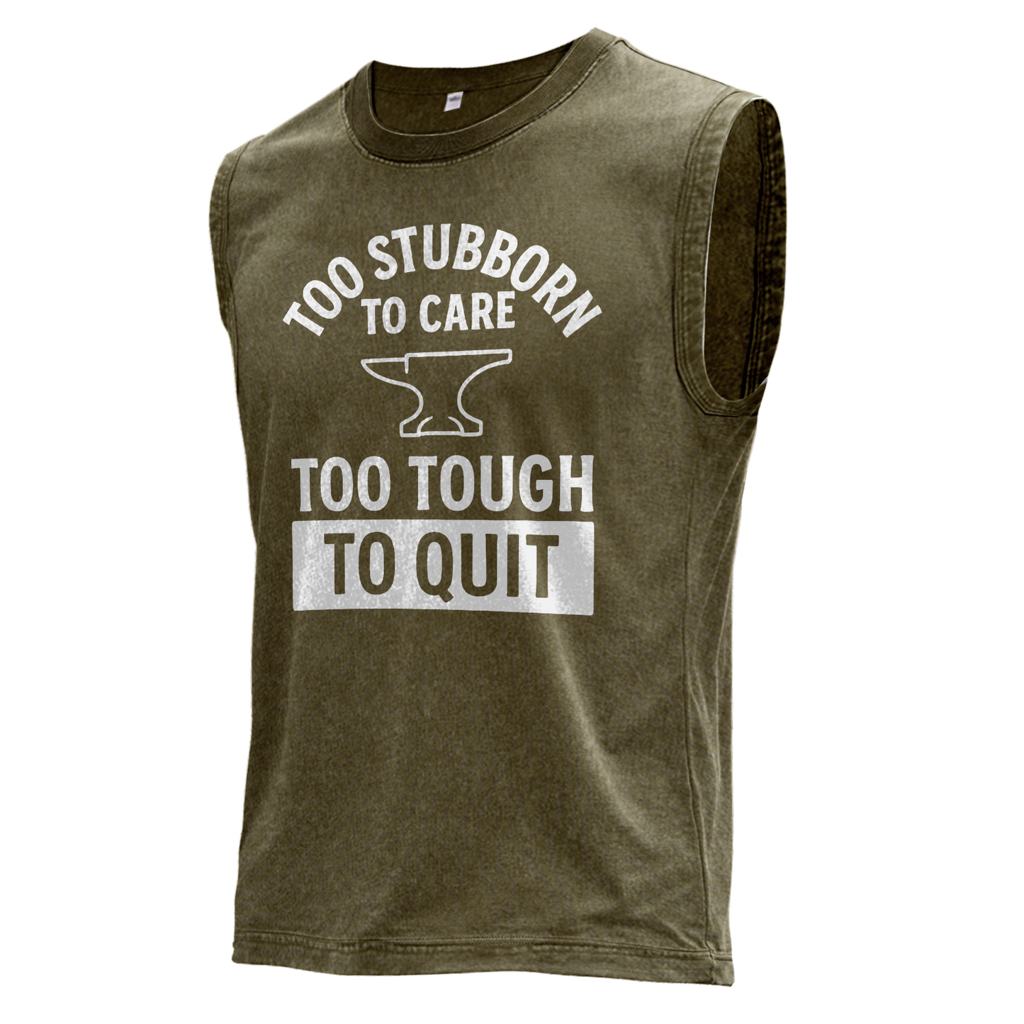 This vintage brown muscle tee features bold, distressed white typography: an arched “TOO STUBBORN TO CARE” above a clean anvil icon, finished with a block badge reading “TOO TOUGH TO QUIT.”