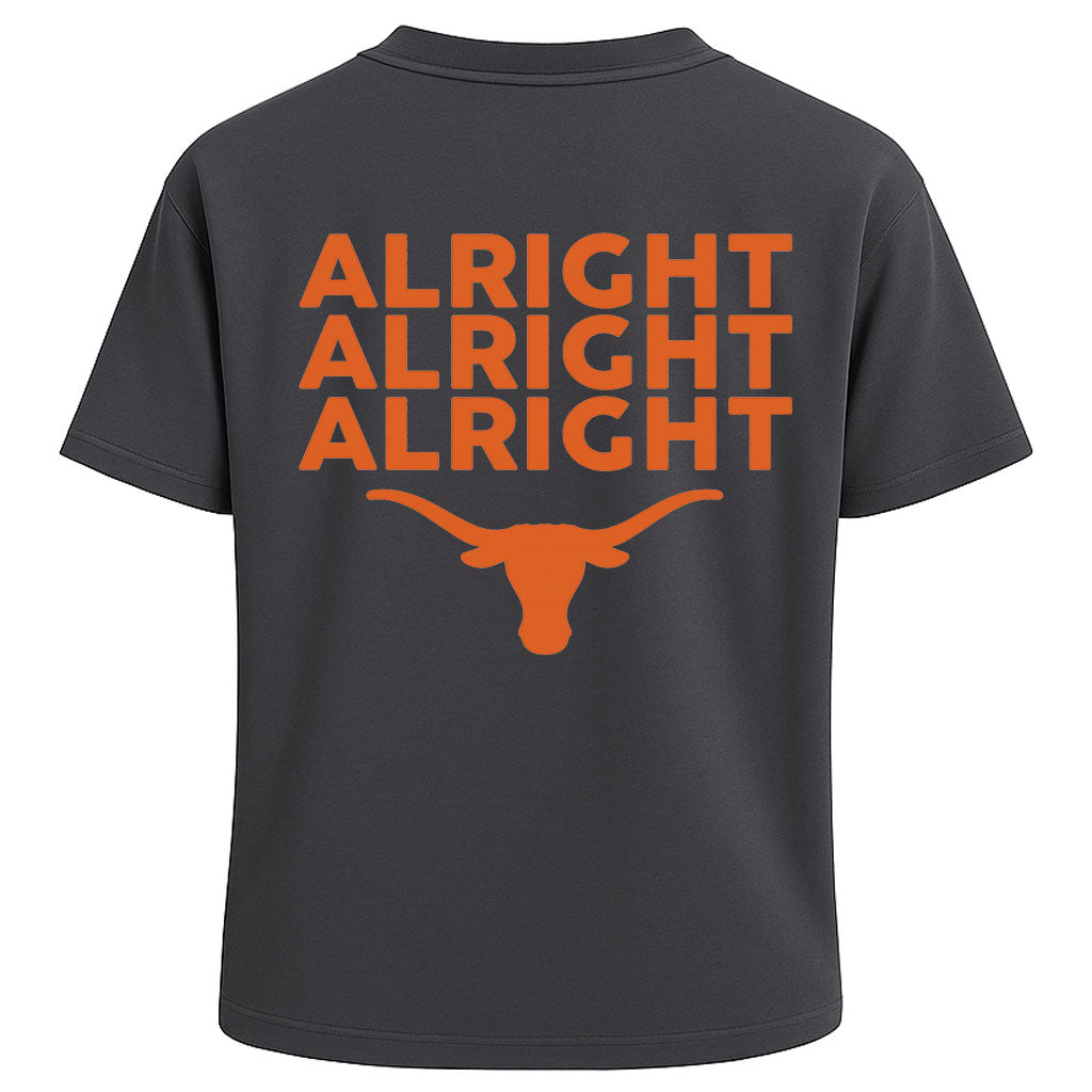 Show off Texas pride and classic swagger with LouMark’s Alright Alright Alright Tee. Made from heavy 260G 100% cotton, this oversized black T-shirt blends durability with a relaxed streetwear fit. The front keeps it minimal with the LouMark longhorn logo, while the back explodes with bold orange text “ALRIGHT ALRIGHT ALRIGHT” above a longhorn silhouette. A timeless nod to Southern confidence and Western heritage.