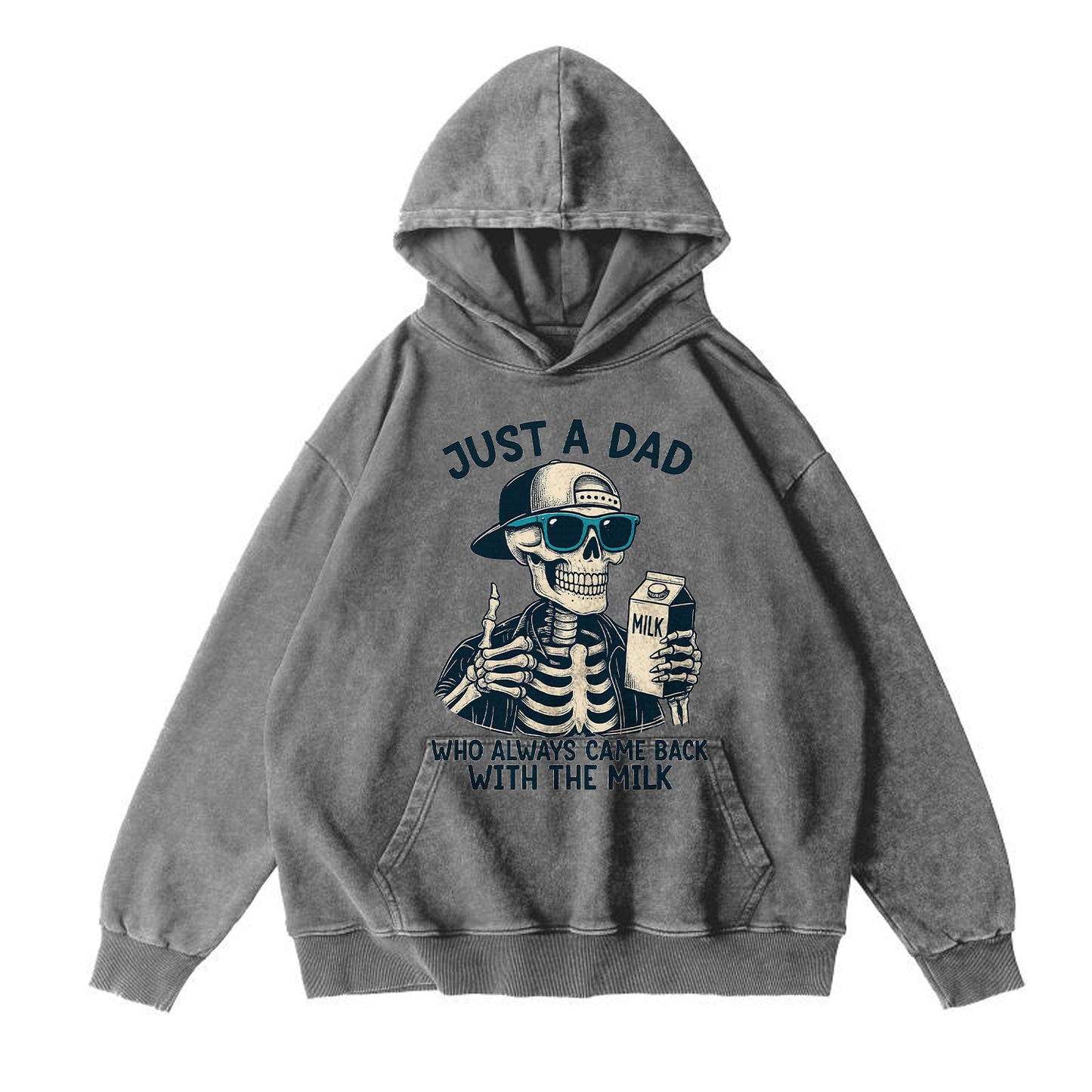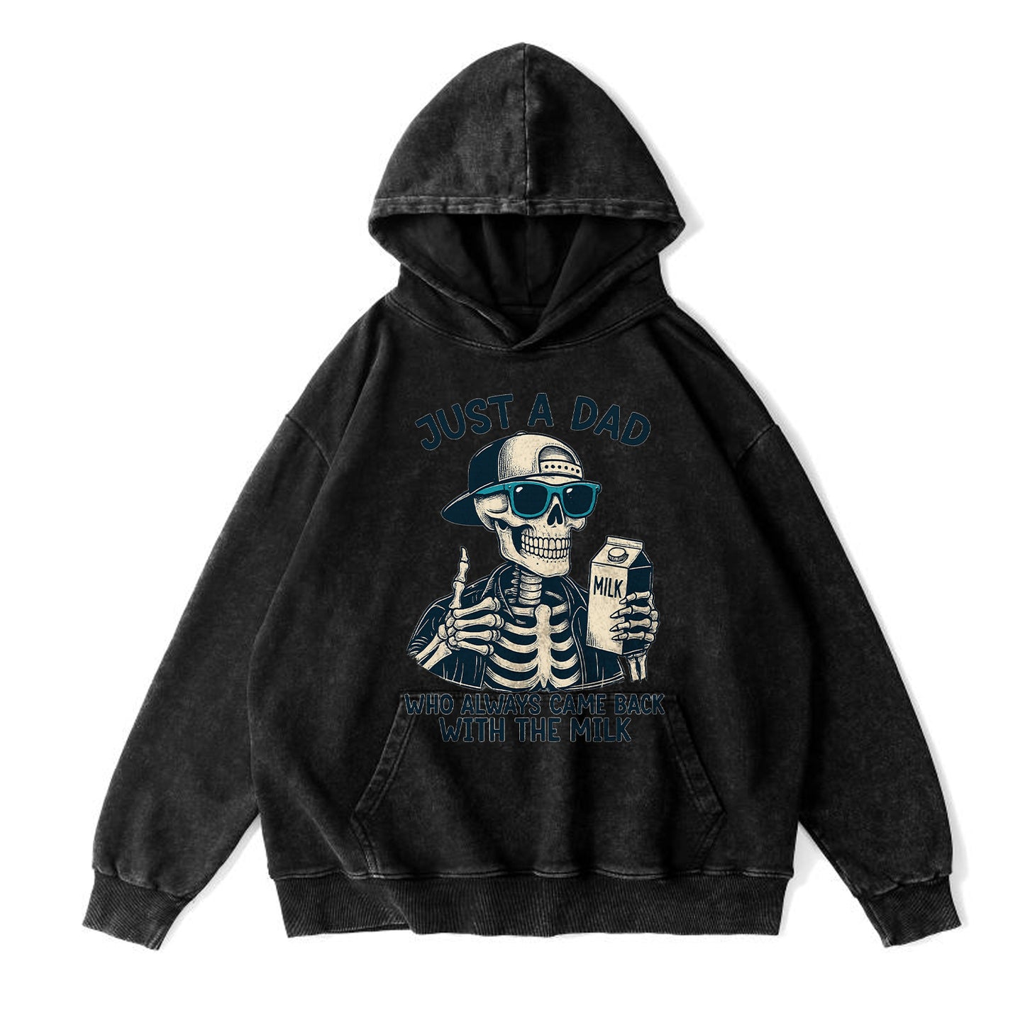 For the dads who deliver—milk included. This vintage-washed army-green hoodie features a playful graphic of a skeleton dad in shades and a cap, proudly holding a milk carton with the headline “JUST A DAD” and subline “WHO ALWAYS CAME BACK WITH THE MILK.” Cut from beefy 350g 100% cotton for a soft, broken-in feel right out of the bag.