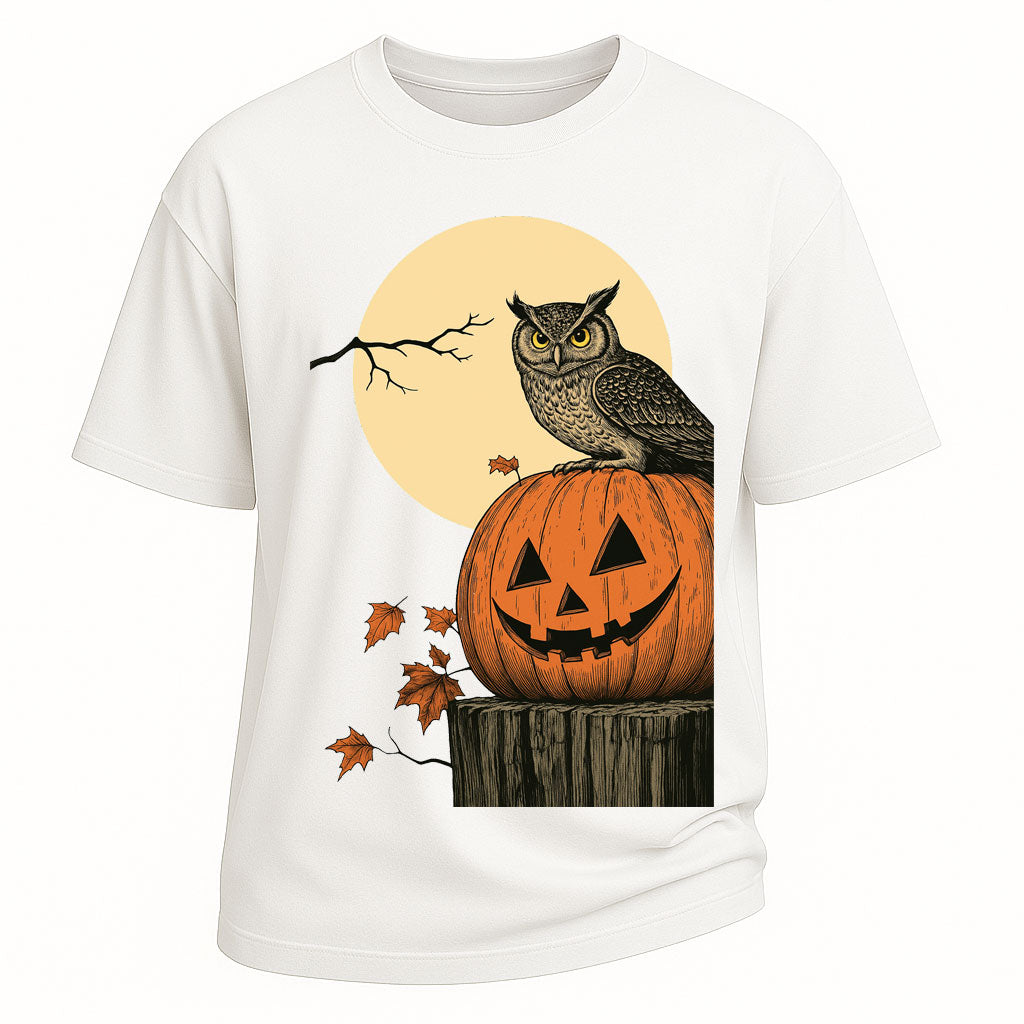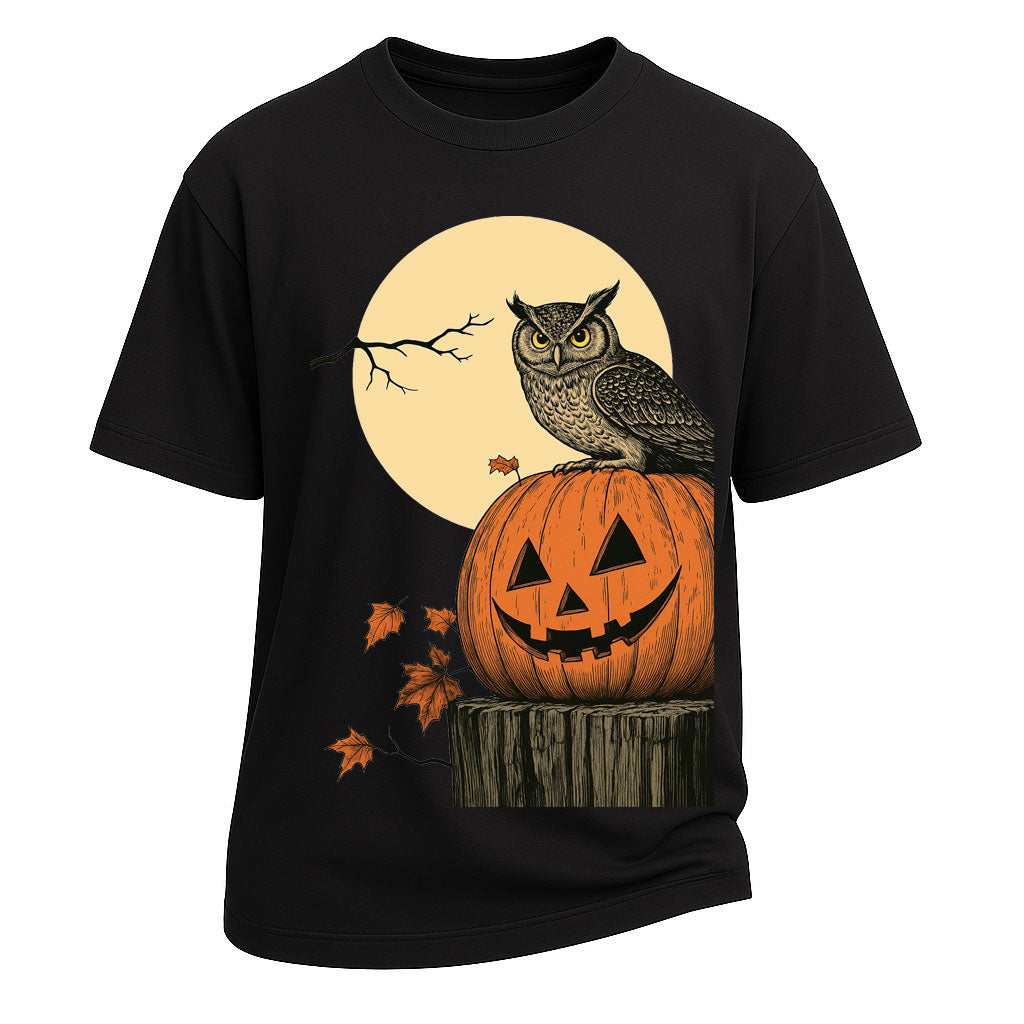 - Style: Halloween owl and jack-o’-lantern graphic tee