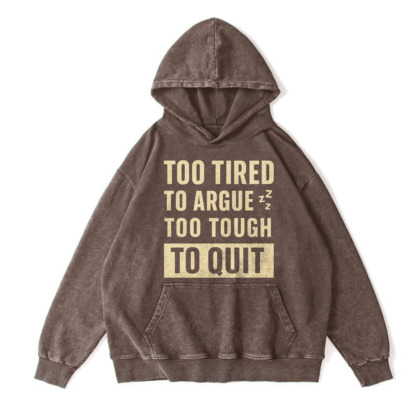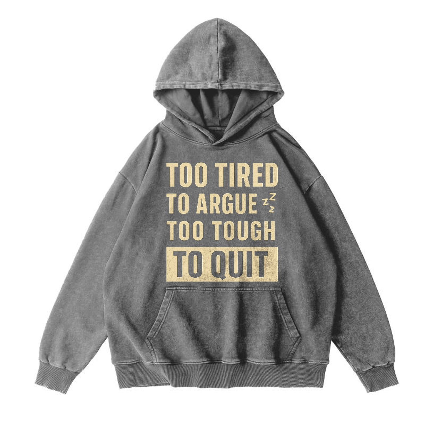 This vintage military green hoodie features oversized, distressed bone/ivory typography stacking “TOO TIRED / TO ARGUE,” accented by tiny Zzz marks, then a bold cream block badge reading “TO QUIT” beneath “TOO TOUGH.”