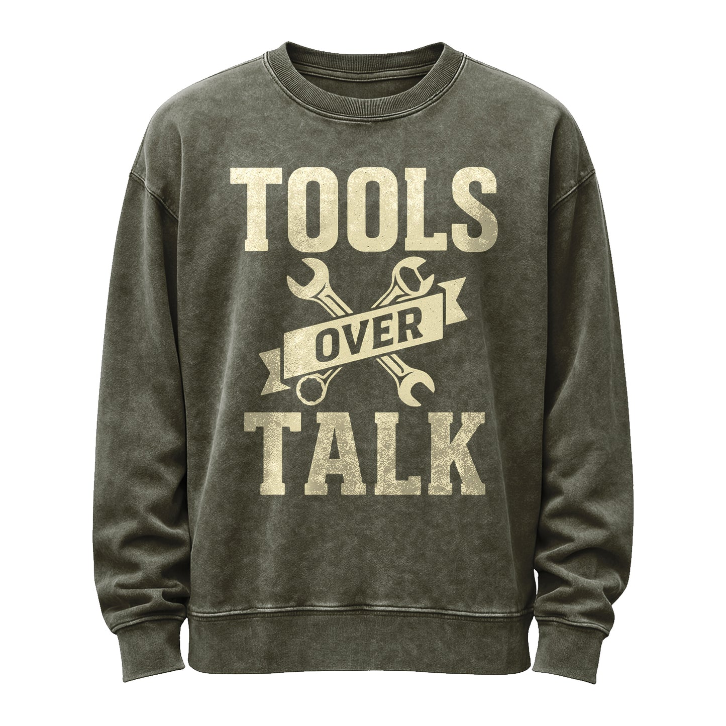 This vintage washed-black crewneck features bold distressed bone/ivory typography reading “TOOLS / TALK,” centered over crossed wrench icons with a banner that reads “OVER.”