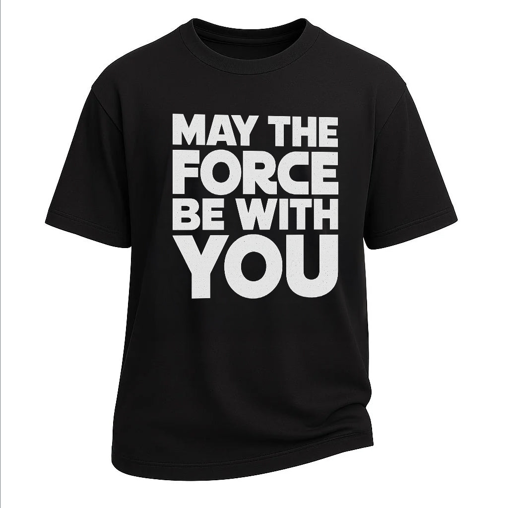 Rinfresca il tuo guardaroba con questa t-shirt blu navy che riecheggia attraverso le galassie. Con l'iconica frase "May the Force Be With You" in grassetto carattere bianco, la t-shirt tributo di LouMark porta l'energia interstellare in uno stile terrestre. Realizzata in morbido cotone e dal taglio senza tempo, è perfetta per i ribelli di tutti i giorni, gli appassionati di fantascienza e coloro che credono in qualcosa di più grande. Indossa la Forza con orgoglio, senza bisogno di una spada laser.