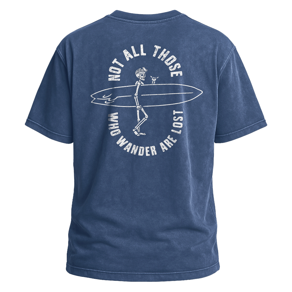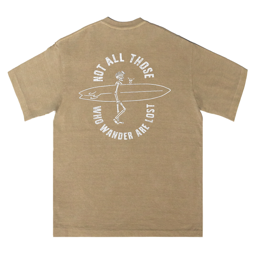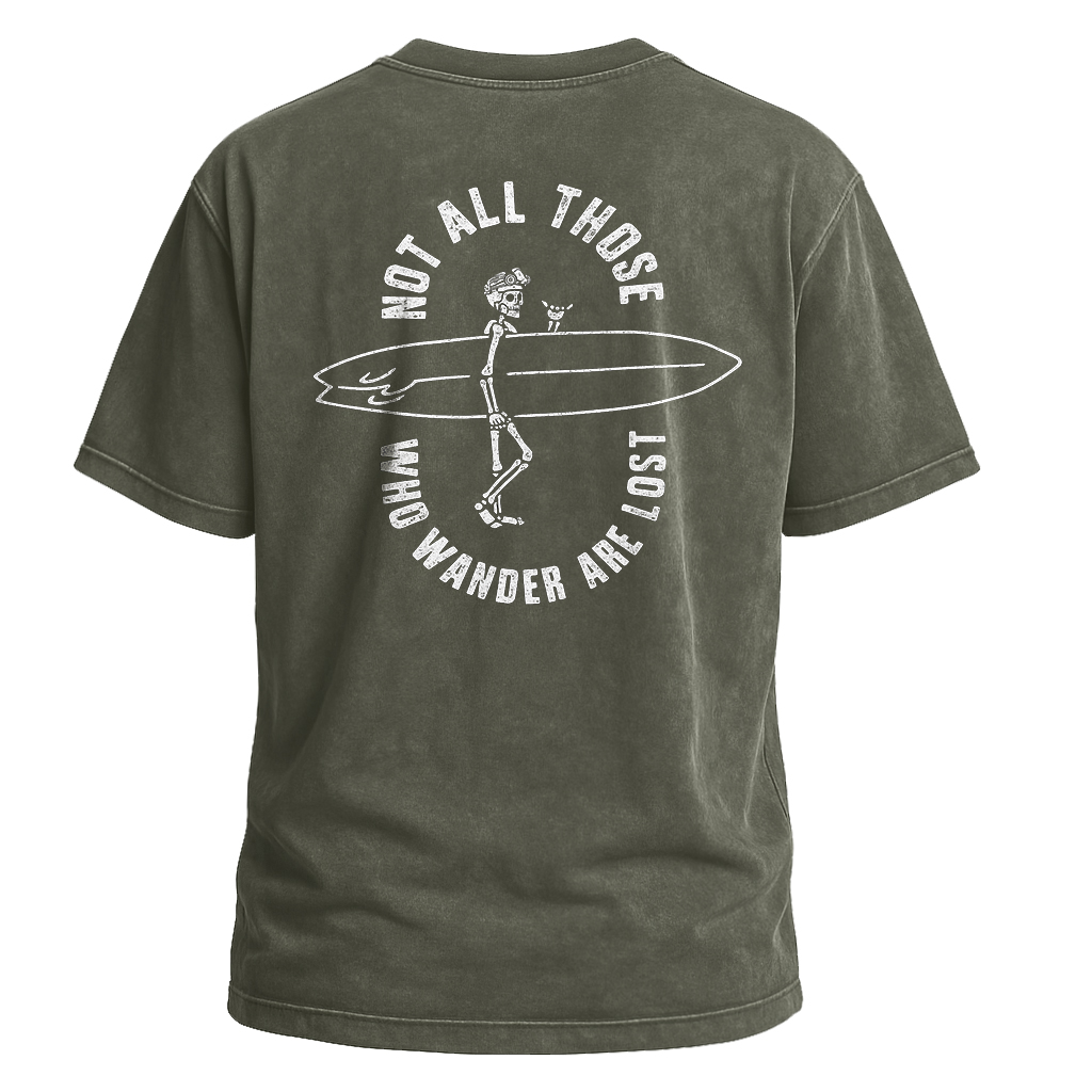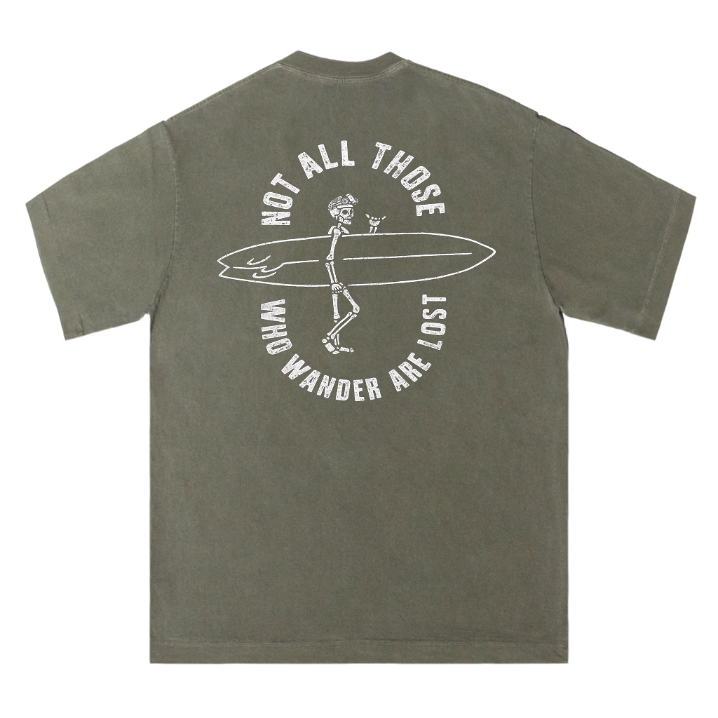 Abbraccia lo spirito d'avventura con la maglietta "Not All Those Who Wander" di LouMark. Questa maglietta marrone slavato presenta una grafica in stile vintage sul retro raffigurante uno scheletro che tiene in mano una tavola da surf, circondata dalla scritta "NOT ALL THOSE WHO WANDER ARE LOST". Realizzata in 100% cotone, è perfetta per un abbigliamento casual e comodo, con un tocco di libertà.