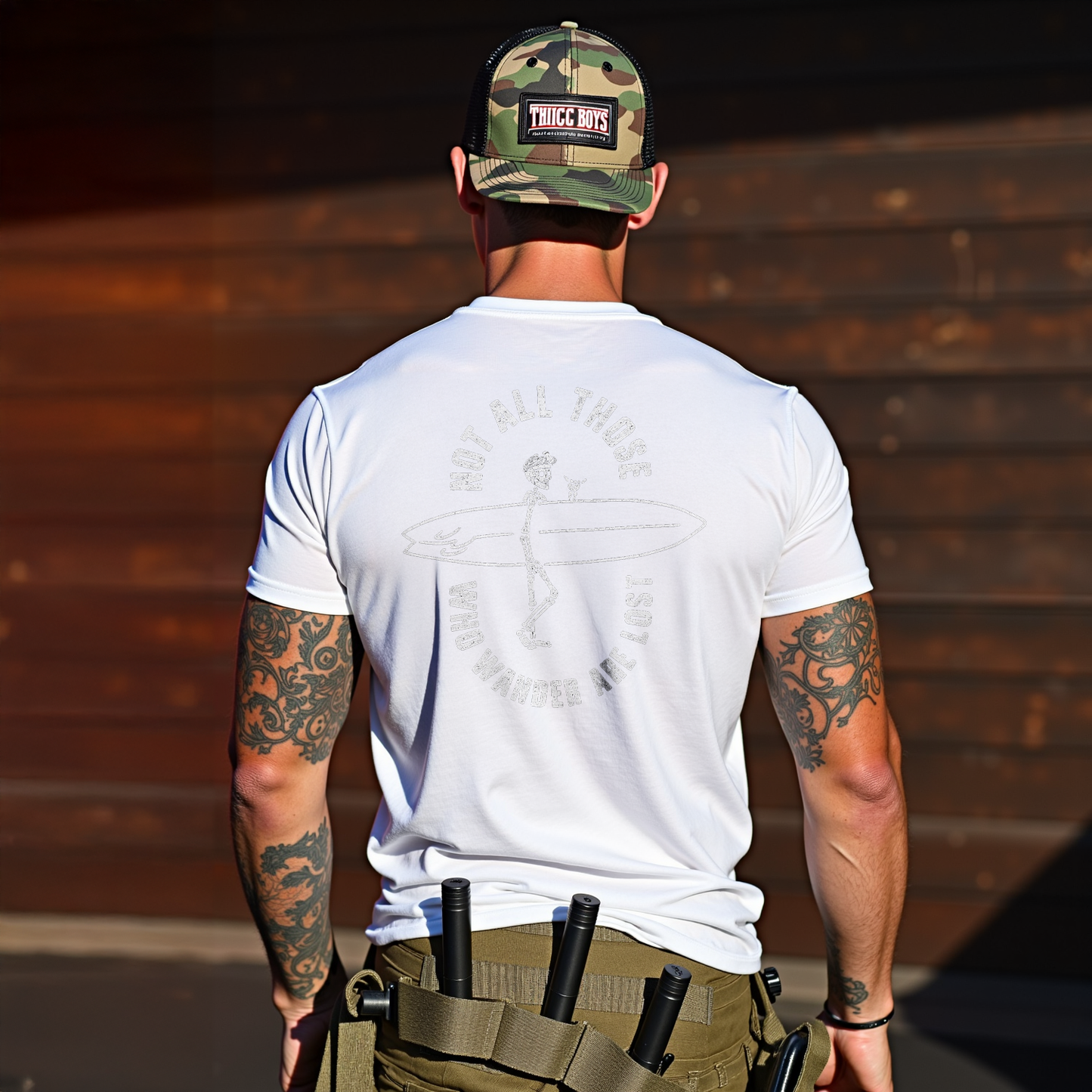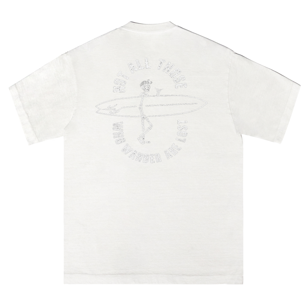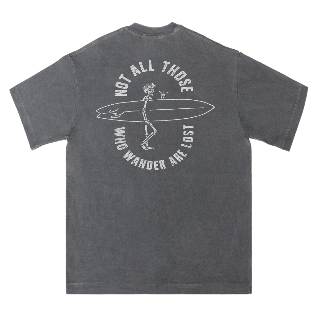 Abbraccia lo spirito d'avventura con la maglietta "Not All Those Who Wander" di LouMark. Questa maglietta marrone slavato presenta una grafica in stile vintage sul retro raffigurante uno scheletro che tiene in mano una tavola da surf, circondata dalla scritta "NOT ALL THOSE WHO WANDER ARE LOST". Realizzata in 100% cotone, è perfetta per un abbigliamento casual e comodo, con un tocco di libertà.