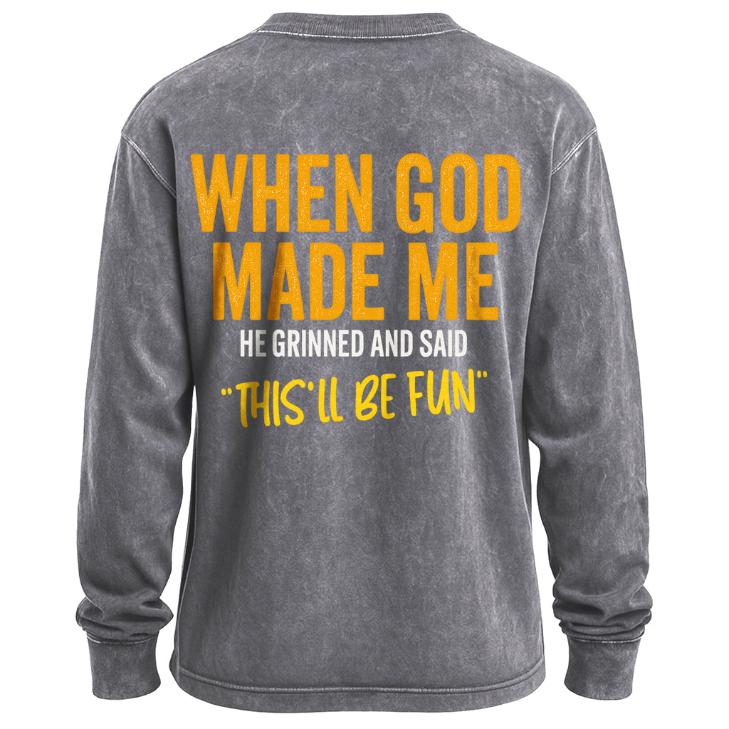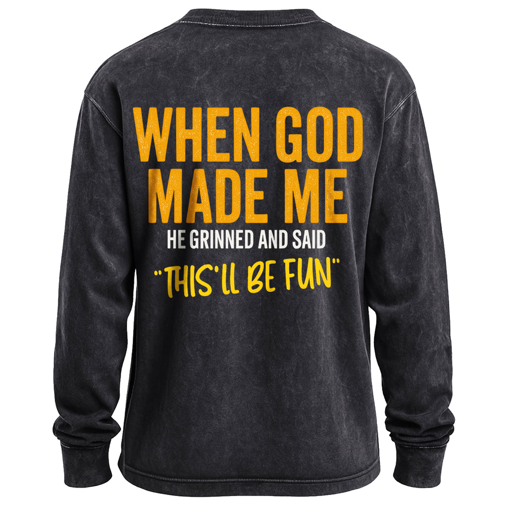 Energia di fede giocosa da indossare. Questa t-shirt nera a maniche lunghe, effetto vintage, presenta una scritta in grassetto bianco e oro che recita: "QUANDO DIO MI CREÒ, SORRIDEVA E DISSE 'QUESTO SARÀ DIVERTENTE'". Realizzata in morbido cotone 100%, è comoda da indossare fin da subito.