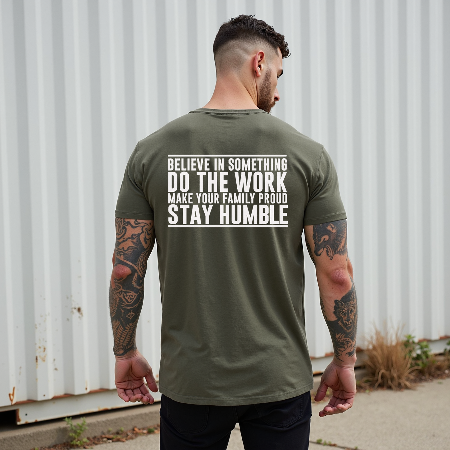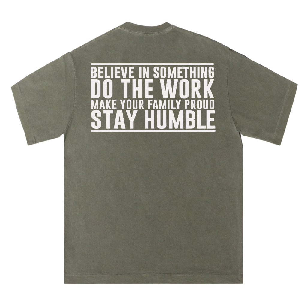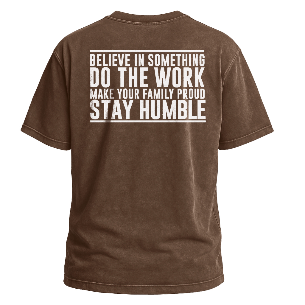 Lasciati ispirare dalla maglietta Believe Do Work Stay Humble di LouMark. Questa maglietta marrone slavato presenta una scritta bianca in grassetto con la scritta "BELIEVE IN SOMETHING DO THE WORK MAKE YOUR FAMILY PROUD STAY HUMBLE". Realizzata in 100% cotone per una vestibilità comoda, con un messaggio motivazionale.