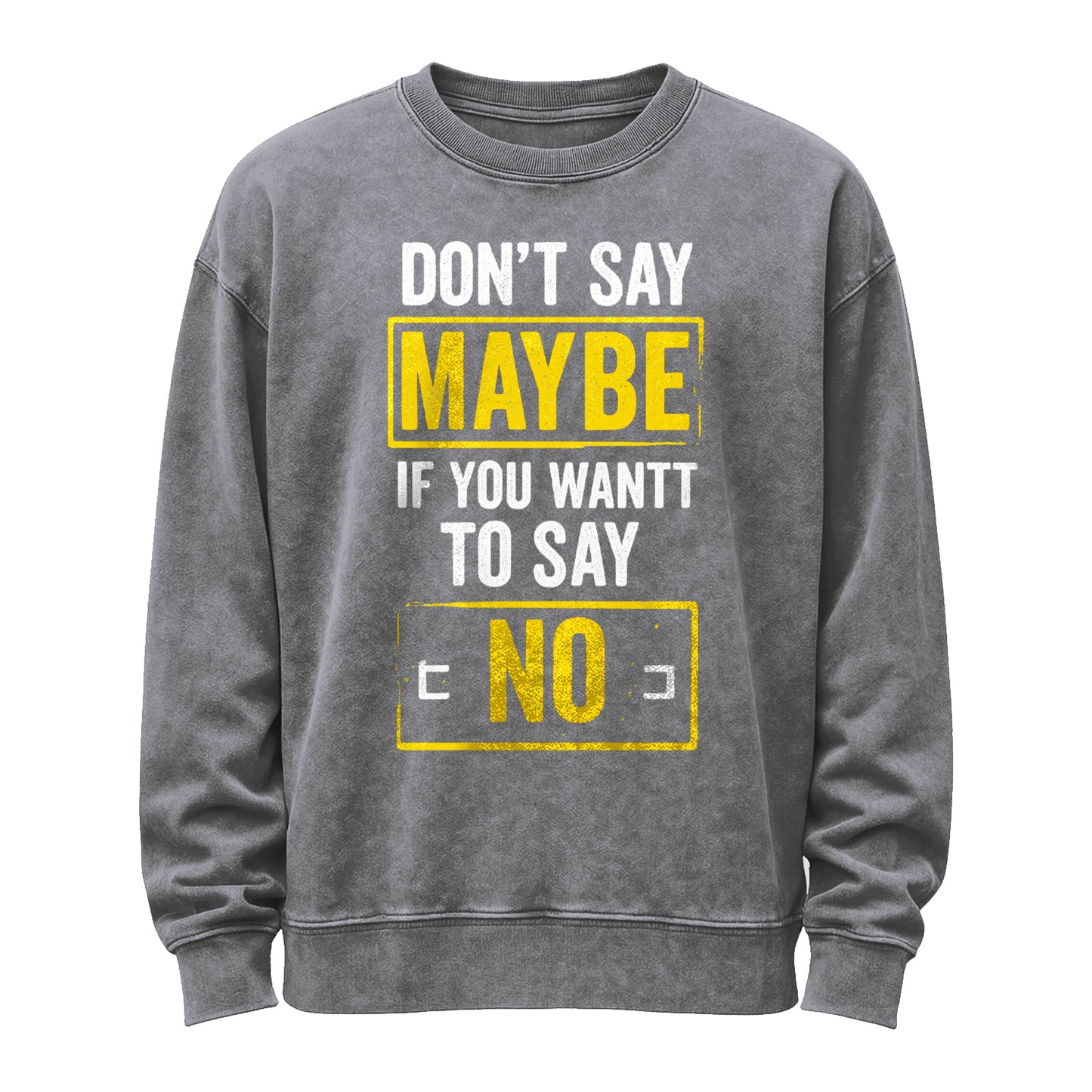 Dillo senza mezzi termini. Questa felpa nera effetto vintage presenta una scritta bianca audace con inserti gialli a contrasto che evidenziano "MAYBE" e "NO", scandendo il mantra: "Non dire forse se vuoi dire no". Realizzata in robusto pile da 350 g (80% cotone / 20% poliestere) per una sensazione di morbidezza e comfort fin dal primo utilizzo.