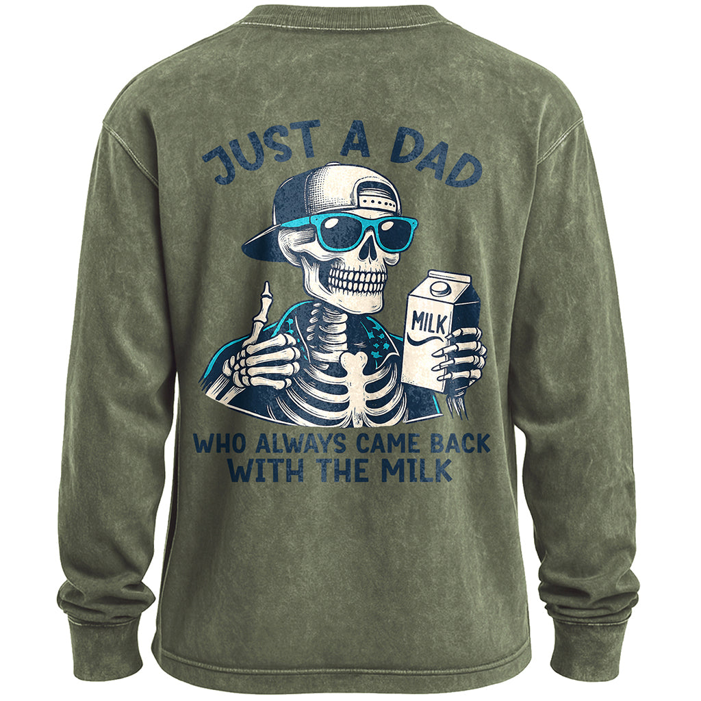 Celebra l'umorismo nero con la t-shirt a maniche lunghe Just a Dad Skeleton di LouMark. Realizzata in 100% cotone 230G , questa maglietta pesante garantisce resistenza e comfort duraturi. La vestibilità standard la rende facile da indossare da sola o sotto le giacche. Caratterizzata da una grafica sul retro di un papà scheletro con occhiali da sole che tiene in mano un cartone del latte con la scritta "Just a Dad Who Always Came Back With the Milk", questa maglietta unisce ironia e audace stile streetwear. I polsini a coste e lo scollo rotondo mantengono il look classico.
