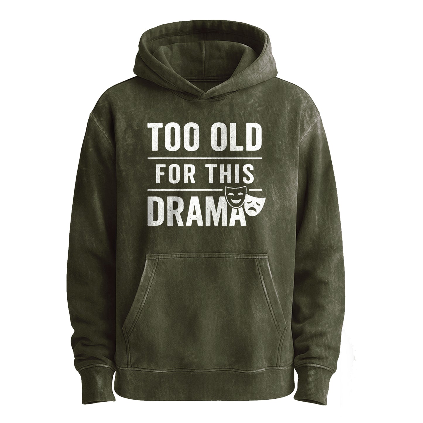 Questa felpa con cappuccio verde militare vintage presenta una scritta bianca oversize e consumata con la scritta "TOO OLD / FOR THIS / DRAMA", separata da regole nette e abbinata a maschere classiche da commedia-tragedia.