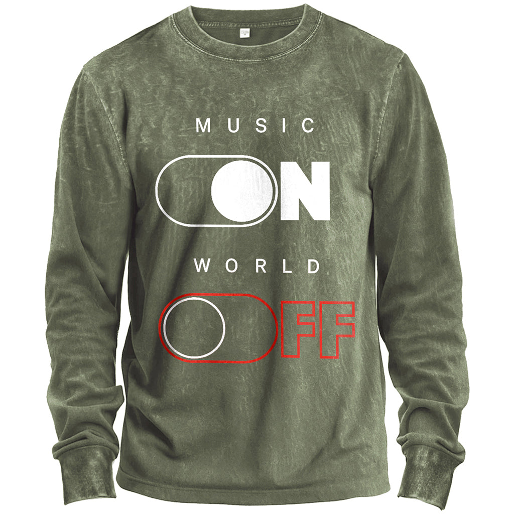 Immergiti nel suono con la t-shirt a maniche lunghe Music On World Off di LouMark. Realizzata in 100% cotone 230G , questa maglietta pesante unisce comfort e resistenza. Il design dalla vestibilità standard la rende facile da indossare da sola o a strati. L'audace grafica frontale presenta un design a forma di alamaro con la scritta "Music On, World Off", che trasmette un messaggio di concentrazione e passione per gli amanti della musica. I polsini a coste e lo scollo rotondo mantengono il look pulito e senza tempo.