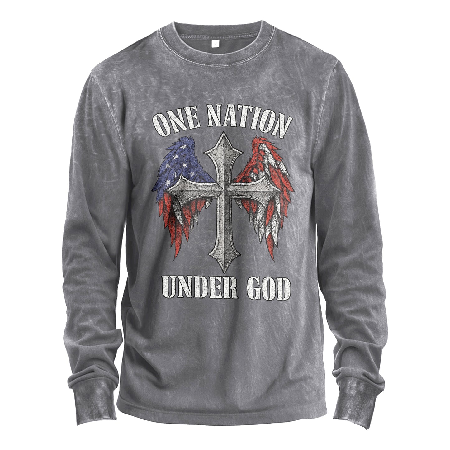 Sostieni la fede e la patria. Questa maglia a maniche lunghe color oliva con lavaggio vintage presenta una croce audace affiancata da ali piumate che richiamano la bandiera americana e la scritta "ONE NATION UNDER GOD". Realizzata in robusto cotone 100% da 230 g, è morbida fin dal primo giorno e realizzata per durare.