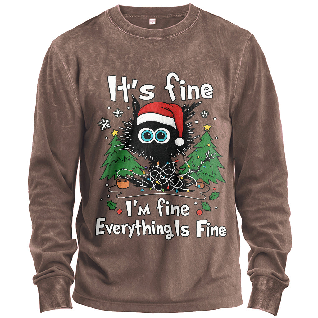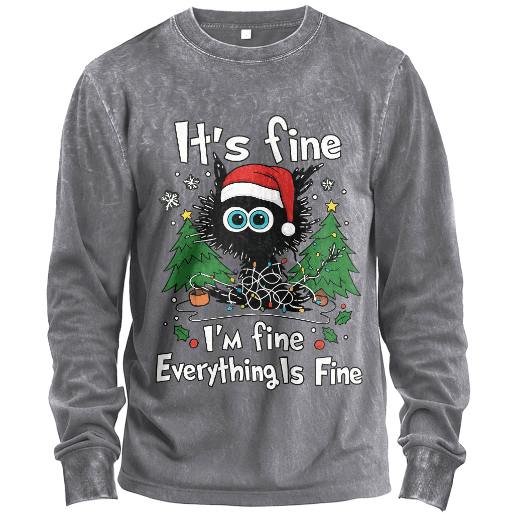Caos natalizio, atmosfera confortevole. Questa t-shirt da uomo a maniche lunghe abbina un body verde militare con lavaggio vintage a una divertente grafica natalizia "Va tutto bene / Sto bene / Tutto va bene": perfetta per feste, regali e per l'uso quotidiano.
