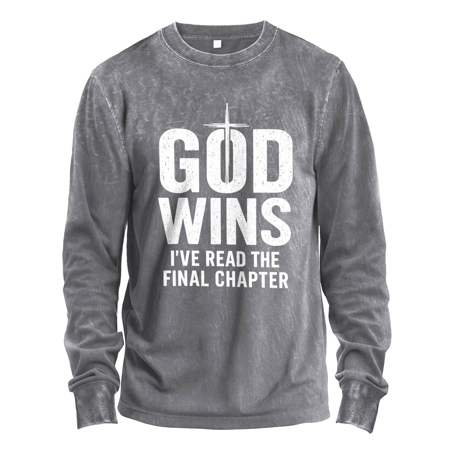 Fedele e fatta per durare. Questa maglia a maniche lunghe color oliva con lavaggio vintage riporta la scritta "GOD WINS - Ho letto l'ultimo capitolo", con un delicato motivo a croce. Realizzata in robusto cotone 100% da 230 g, offre una sensazione di morbidezza e comfort fin da subito.