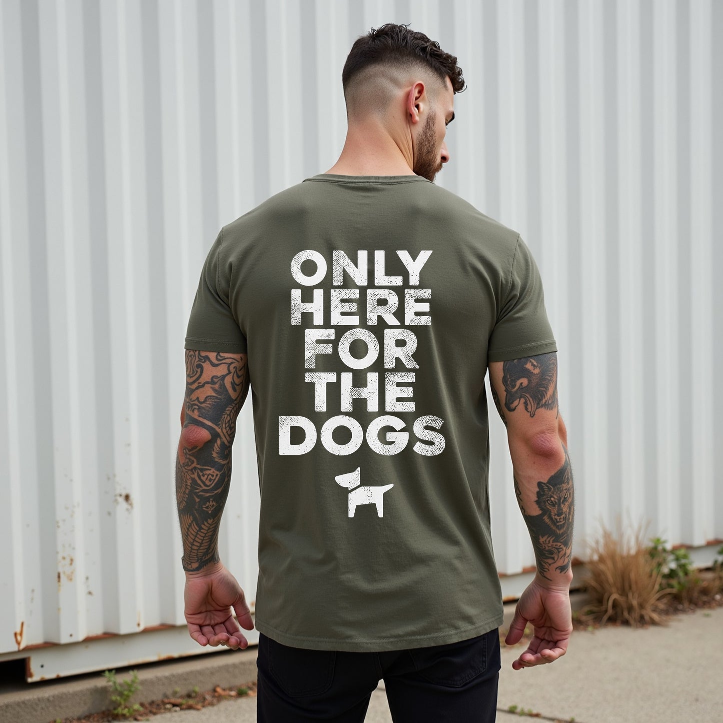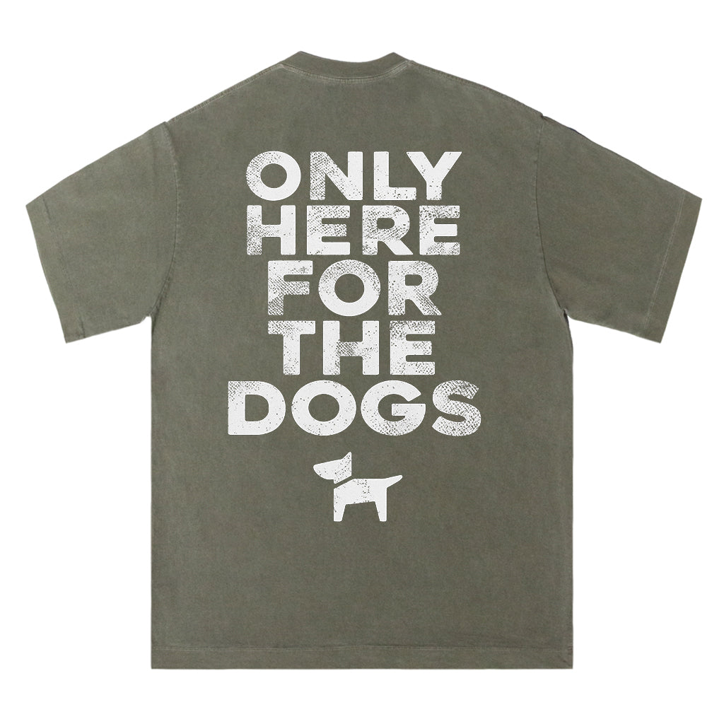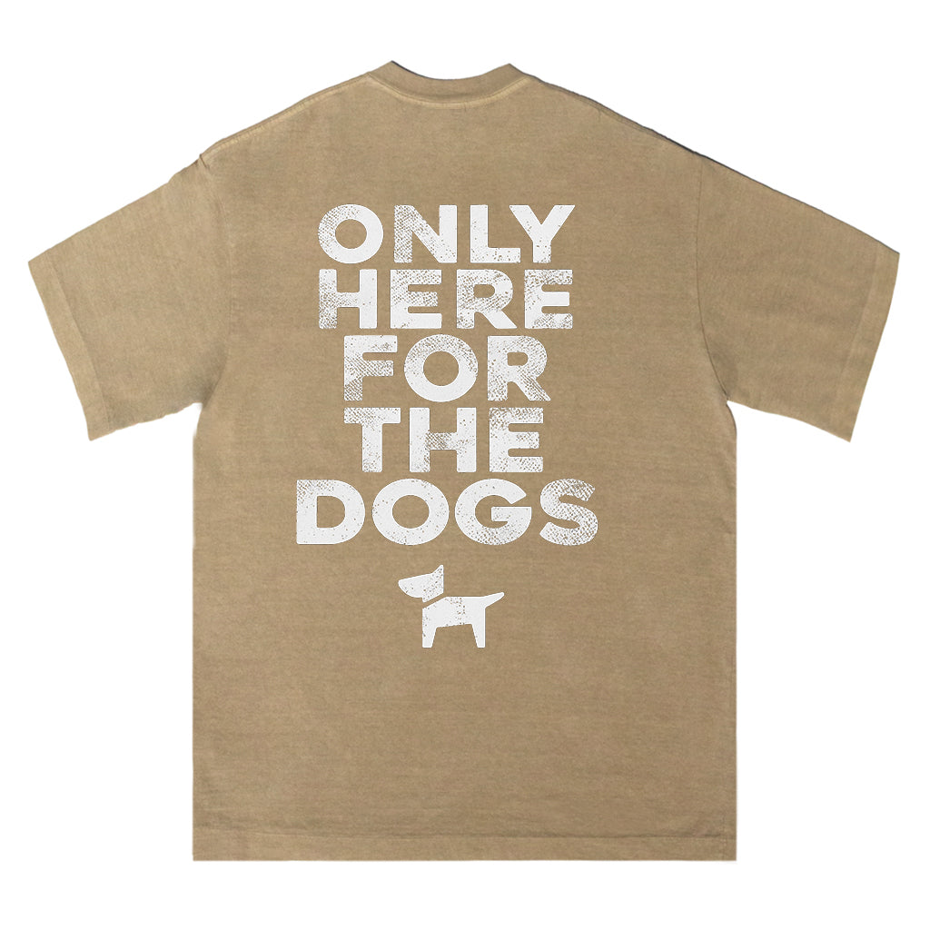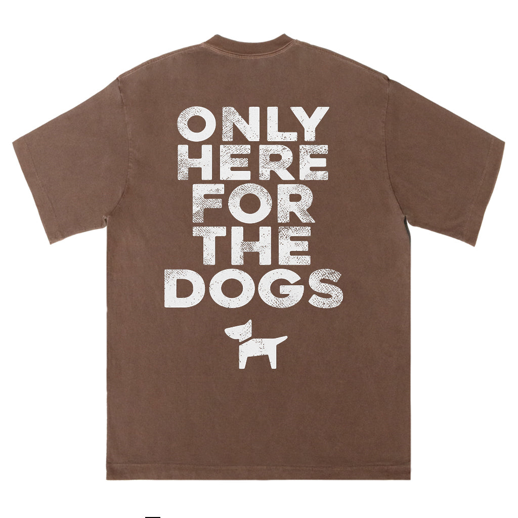Mostra il tuo amore per i cani con la maglietta "Only Here for the Dogs" di LouMark. Questa maglietta marrone slavato presenta la scritta bianca "ONLY HERE FOR THE DOGS" sopra una semplice grafica raffigurante una silhouette di cane. Realizzata in 100% cotone, è comoda e casual, con un tocco giocoso.