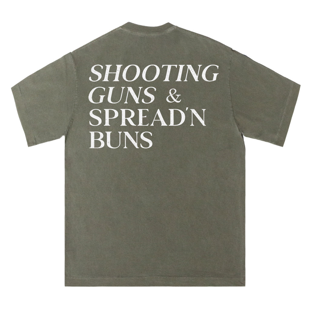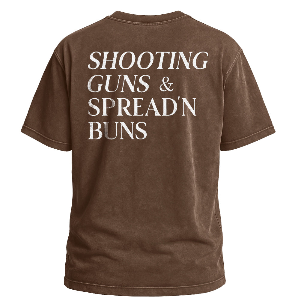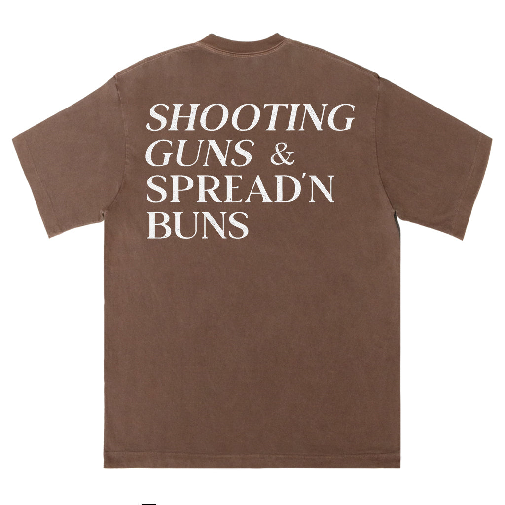 Fai una dichiarazione audace e giocosa con la maglietta "Shooting Guns & Spread'n Buns" di LouMark. Questa maglietta marrone slavato presenta una scritta bianca in stile vintage sul retro con la scritta "SHOOTING GUNS & SPREAD'N BUNS". Realizzata in 100% cotone, è perfetta per un abbigliamento casual comodo e sfacciato.