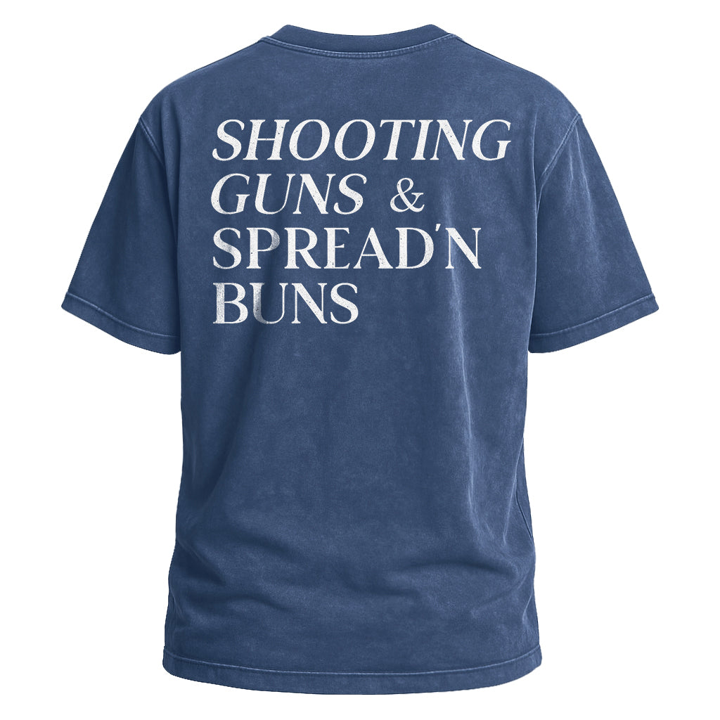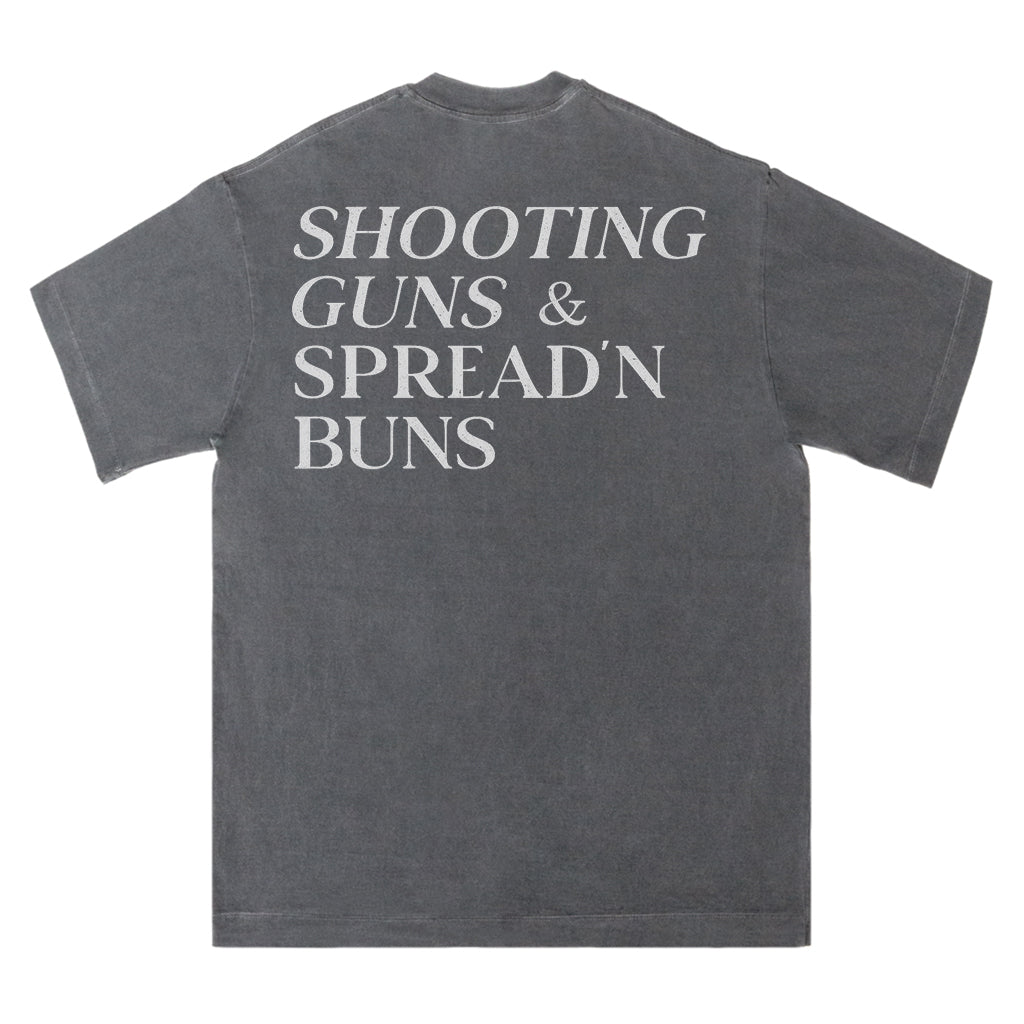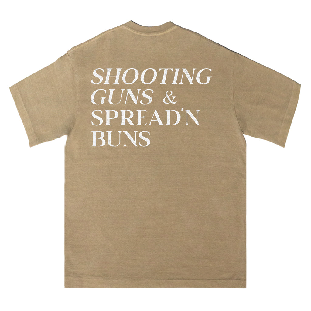 Fai una dichiarazione audace e giocosa con la maglietta "Shooting Guns & Spread'n Buns" di LouMark. Questa maglietta marrone slavato presenta una scritta bianca in stile vintage sul retro con la scritta "SHOOTING GUNS & SPREAD'N BUNS". Realizzata in 100% cotone, è perfetta per un abbigliamento casual comodo e sfacciato.