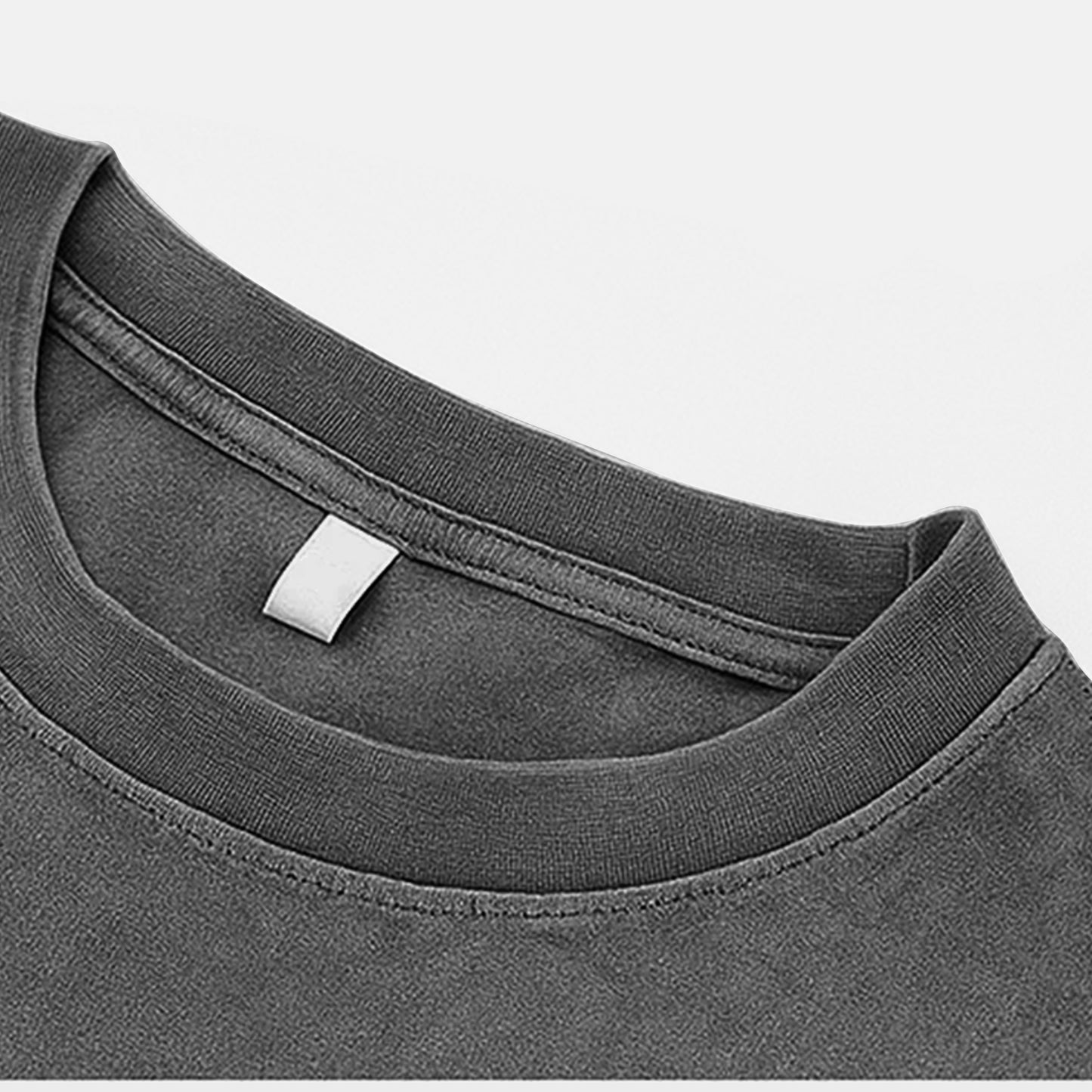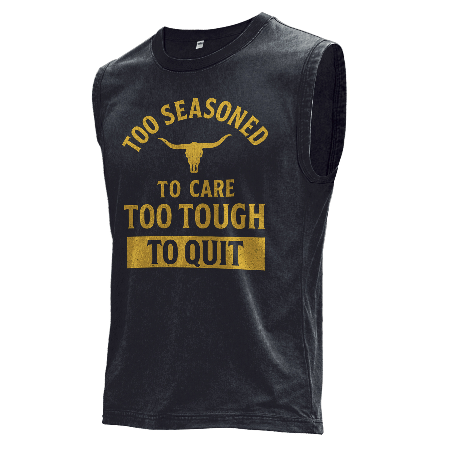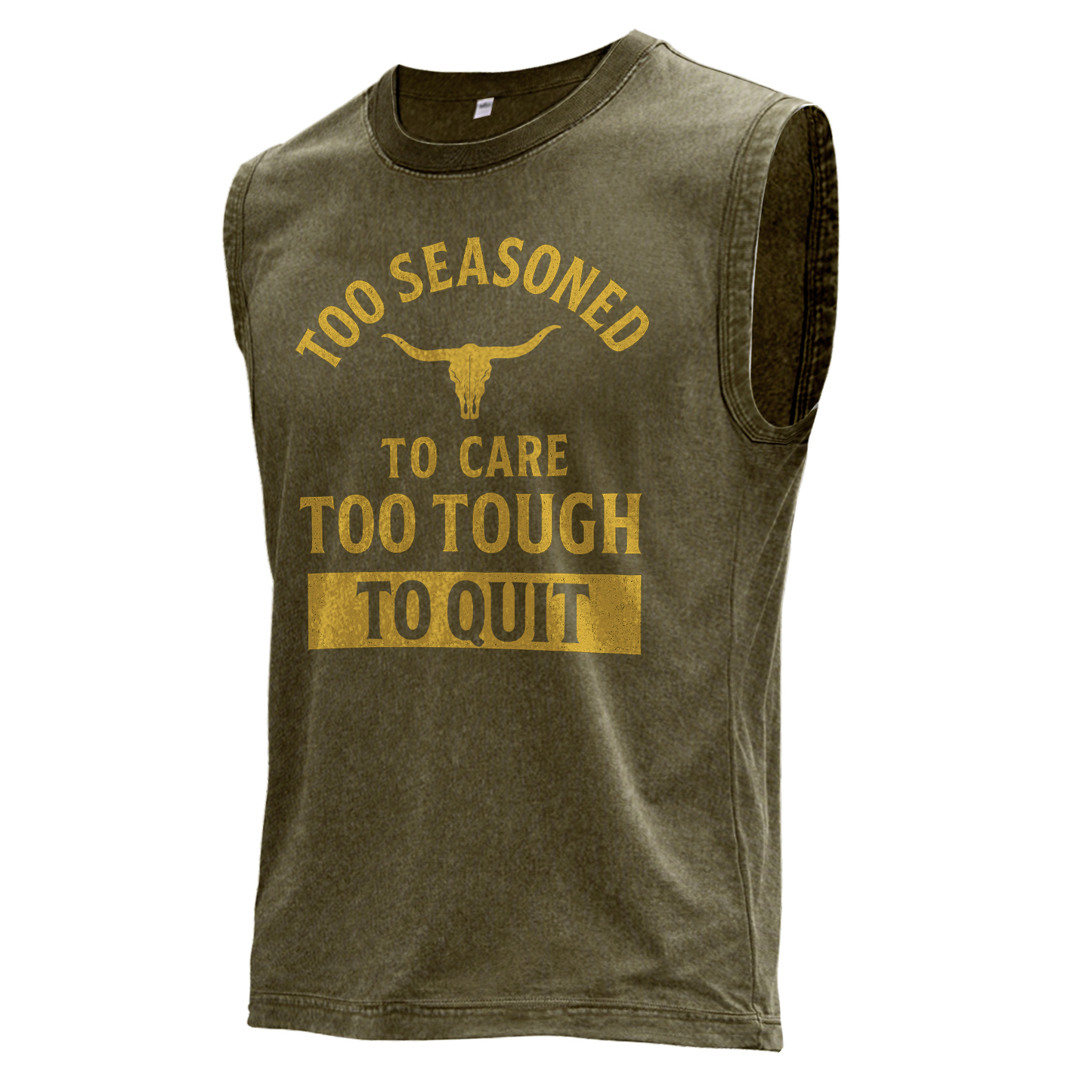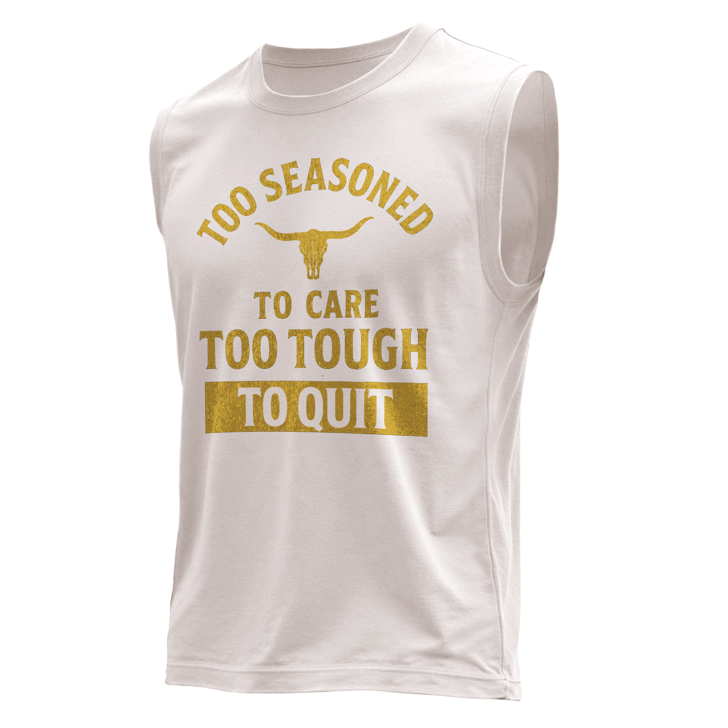 Questa maglietta vintage marrone presenta una tipografia dorata invecchiata: la scritta "TOO SEASONED" arcuata con l'icona di un teschio longhorn, la scritta "TO CARE / TOO TOUGH" sovrapposta e la scritta "TO QUIT" in grassetto.