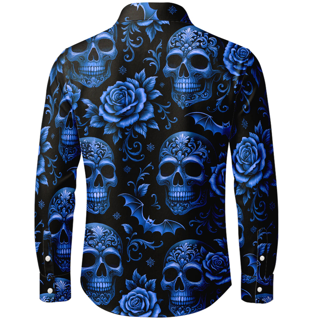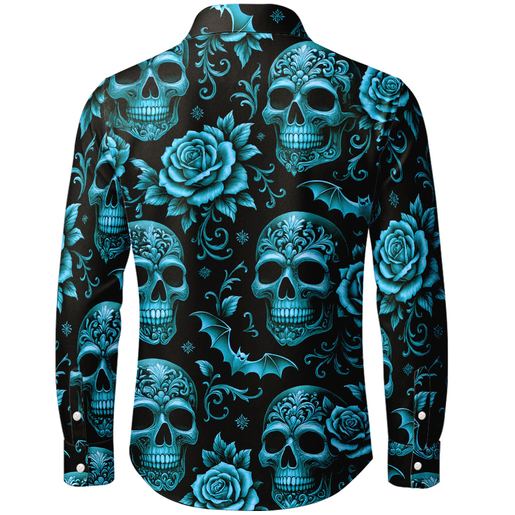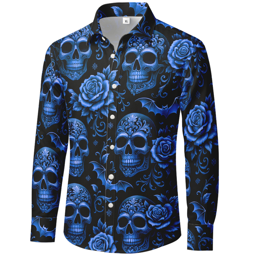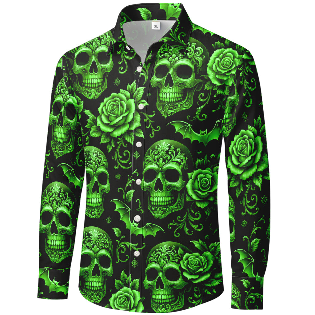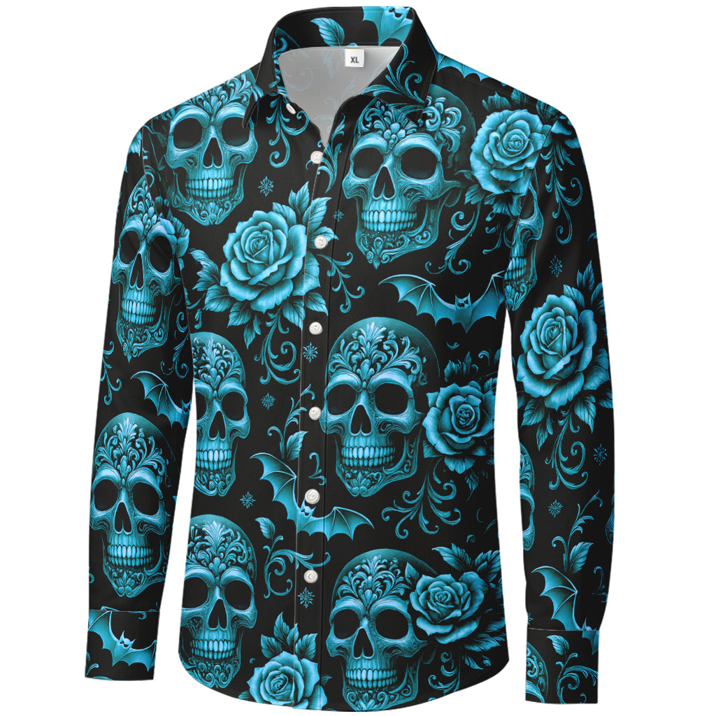 Immergiti nella decadenza. Questa camicia a maniche lunghe con bottoni sovrappone teschi dorati decorati con volute barocche, rose in fiore e pipistrelli in picchiata su uno sfondo nero intenso. La stampa a sublimazione 3D da bordo a bordo offre lussuose tonalità metallizzate e dettagli nitidi dal colletto all'orlo. Realizzata in morbido poliestere al 100%, è leggera, antipiega e ad asciugatura rapida: perfetta per concerti, feste, festival e streetwear di tendenza.