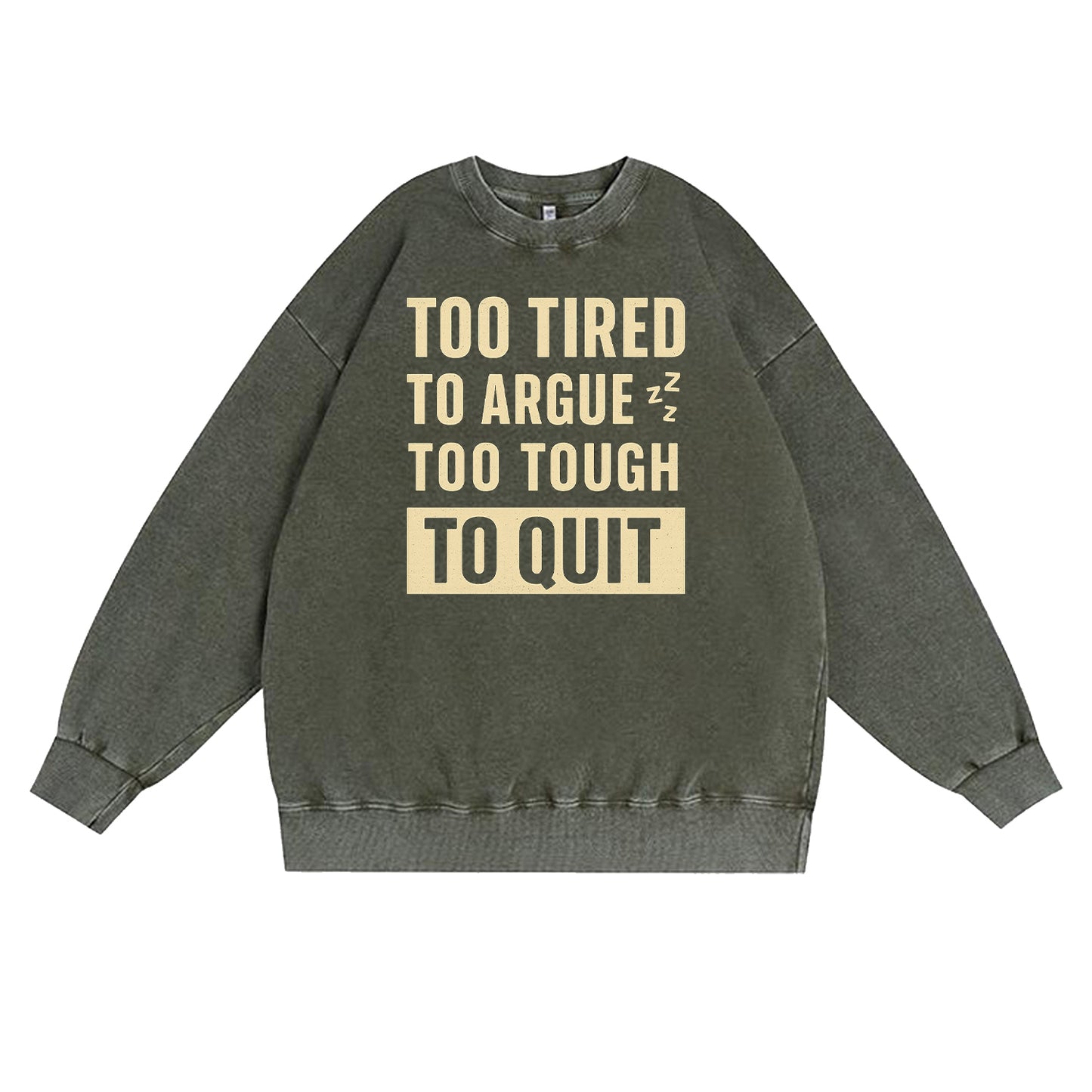 Questa maglia girocollo vintage in nero lavato presenta una scritta oversize in osso/avorio consumata, "TOO TIRED / TO ARGUE", con piccoli segni Zzz, sopra "TOO TOUGH", e termina con un audace blocco color crema con la scritta "TO QUIT".